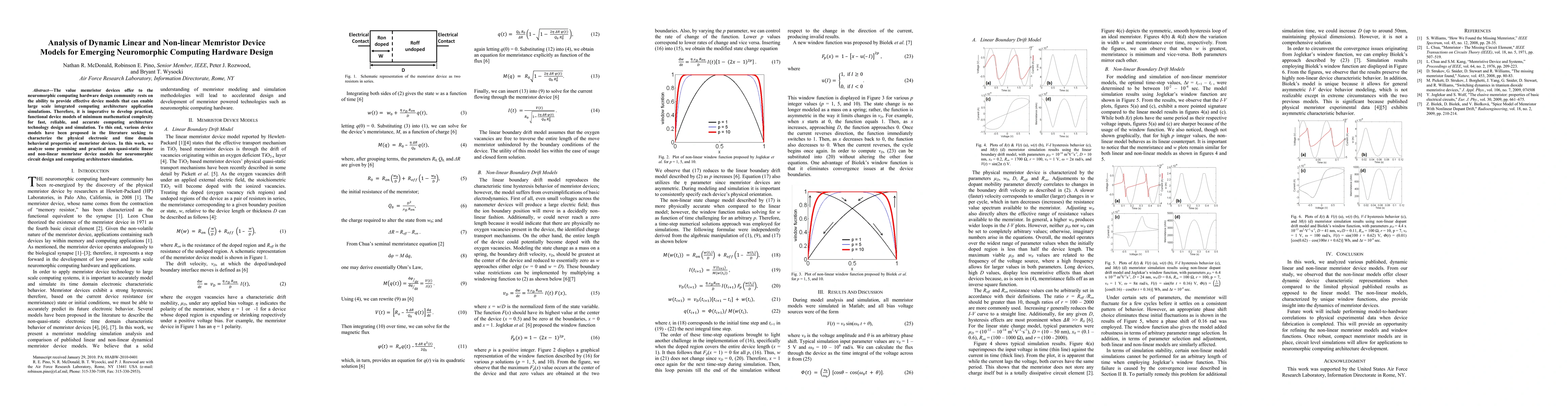 The value memristor devices offer to the neuromorphic computing hardware design community rests on the ability to provide effective device models that can enable large scale integrated computing architecture application simulations. Therefore, it is imperative to develop practical, functional device models of minimum mathematical complexity for fast, reliable, and accurate computing architecture technology design and simulation. To this end, various device models have been proposed in the literature seeking to characterize the physical electronic and time domain behavioral properties of memristor devices. In this work, we analyze some promising and practical non-quasi-static linear and non-linear memristor device models for neuromorphic circuit design and computing architecture simulation.