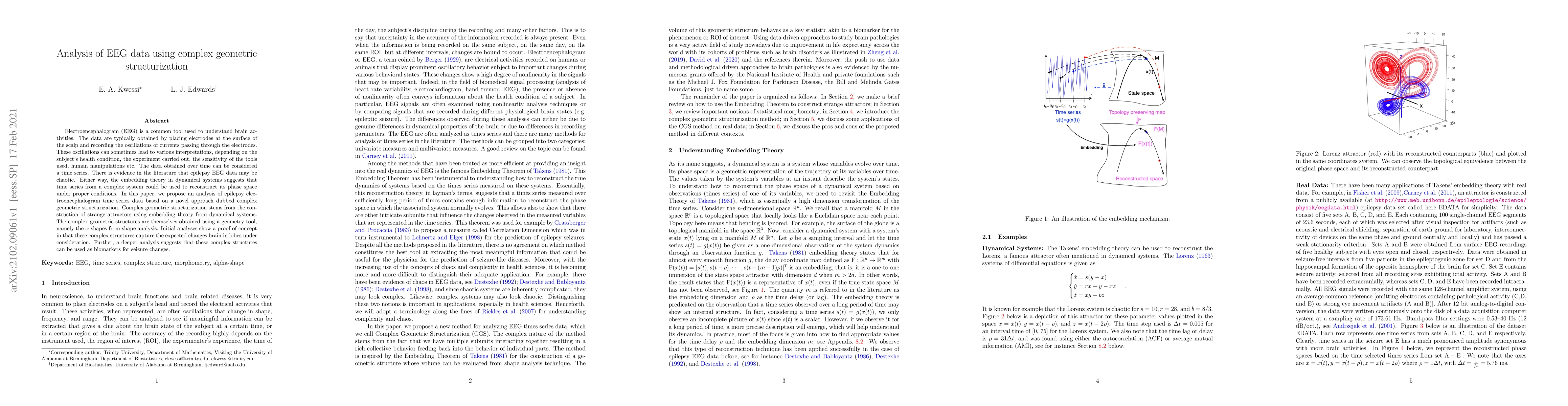 This paper proposes a novel approach called complex geometric structurization to analyze EEG data, particularly for epilepsy, using embedding theory and $\alpha$-shapes from shape analysis. Initial results indicate that these complex structures can serve as biomarkers for detecting seizure changes in brain lobes.