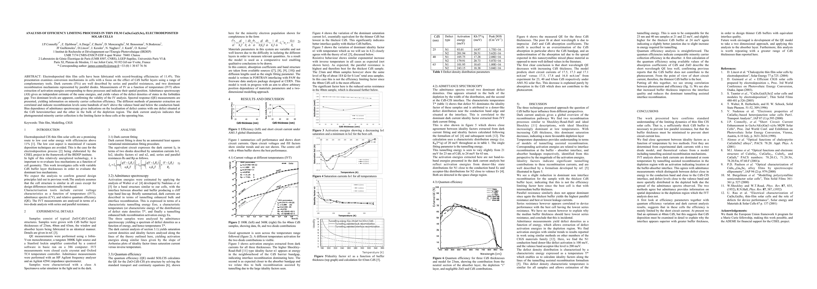 Electrodeposited thin film cells have been fabricated with record-breaking efficiencies of 11.4%. This presentation examines conversion mechanisms in cells with a focus on the effect of CdS buffer layers using a range of complementary tools. Dark currents (IVs) are well described by series and parallel resistances, and two dominant recombination mechanisms represented by parallel diodes. Measurements of IV as a function of temperature (IVT) allow extraction of activation energies corresponding to these processes and indicate their spatial position. Admittance spectroscopy (AS) gives an independent estimate of the same energies, and yields values of the defect densities of states in the forbidden gap. Two dominant levels are apparent, confirming the validity of the IV analysis. Spectral response (QE) measurements are presented, yielding information on minority carrier collection efficiency. The different methods of parameter extraction are correlated and indicate recombination levels some hundreds of meV above the valence band and below the conduction band. Bias dependence of admittance spectroscopy gives indications on the localisation of defect centres with one defect situated at the CdS heterointerface and the other in the bulk of the depletion region. The dark current analysis indicates that photogenerated minority carrier collection is the limiting factor in these cells at the operating bias.