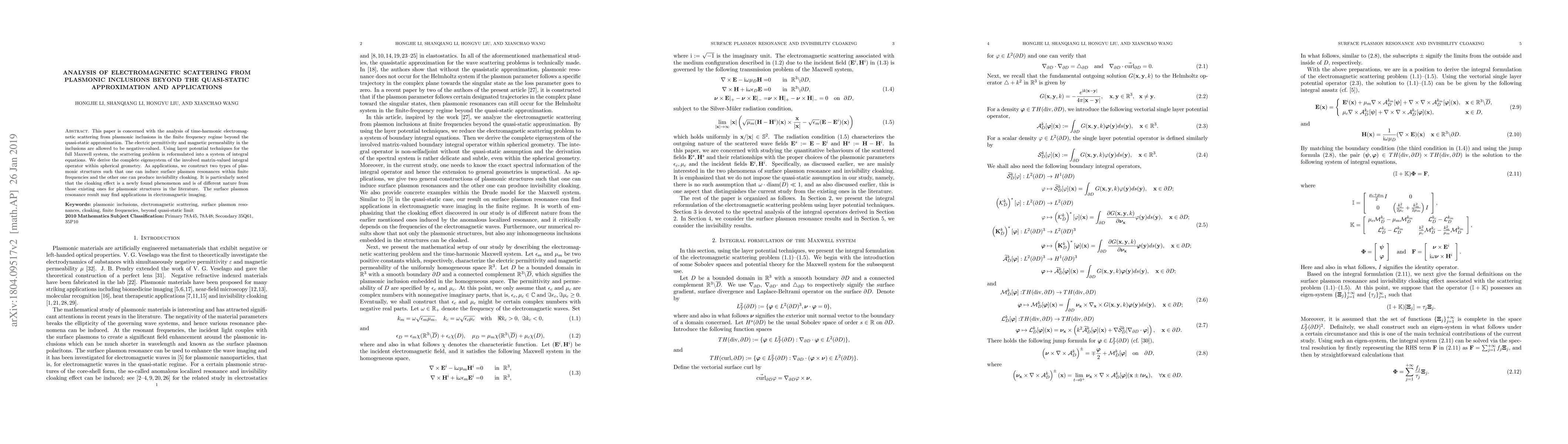 This paper analyzes electromagnetic scattering from plasmonic inclusions beyond the quasi-static approximation, reformulating the problem into integral equations and deriving a complete eigensystem. It introduces novel plasmonic structures for surface plasmon resonances and invisibility cloaking.