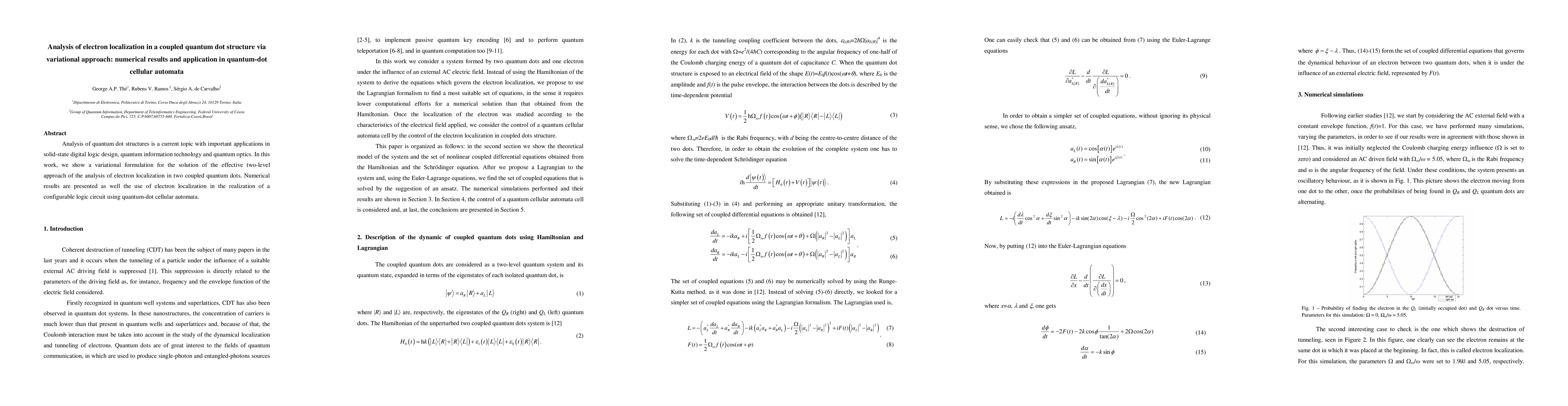 Analysis of quantum dot structures is a current topic with important applications in solid-state digital logic design, quantum information technology and quantum optics. In this work, we show a variational formulation for the solution of the effective two-level approach of the analysis of electron localization in two coupled quantum dots. Numerical results are presented as well the use of electron localization in the realization of a configurable logic circuit using quantum-dot cellular automata.