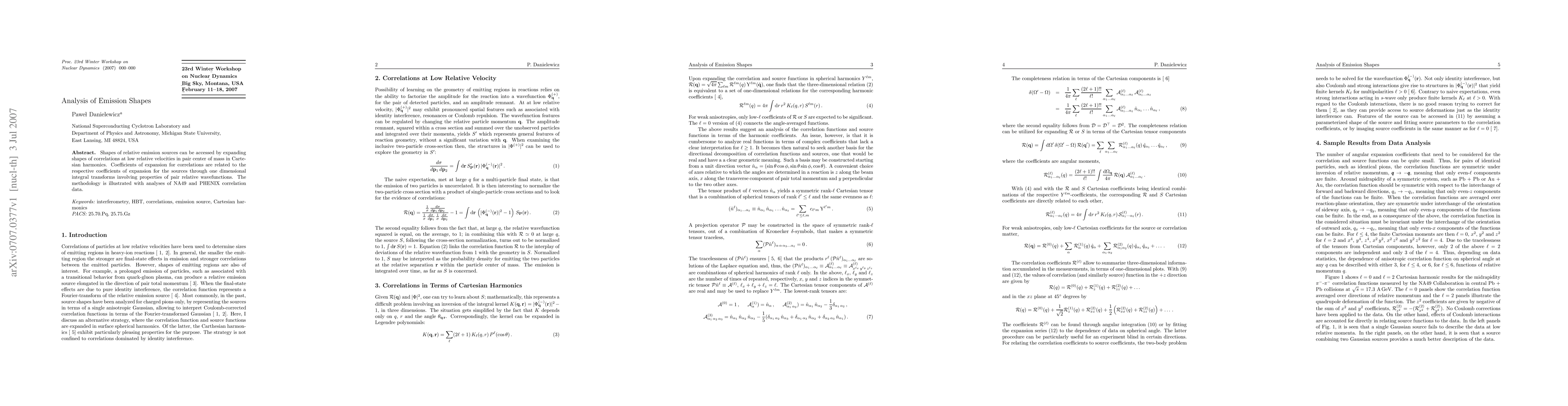 Shapes of relative emission sources can be accessed by expanding shapes of correlations at low relative velocities in pair center of mass in Cartesian harmonics. Coefficients of expansion for correlations are related to the respective coefficients of expansion for the sources through one dimensional integral transforms involving properties of pair relative wavefunctions. The methodology is illustrated with analyses of NA49 and PHENIX correlation data.