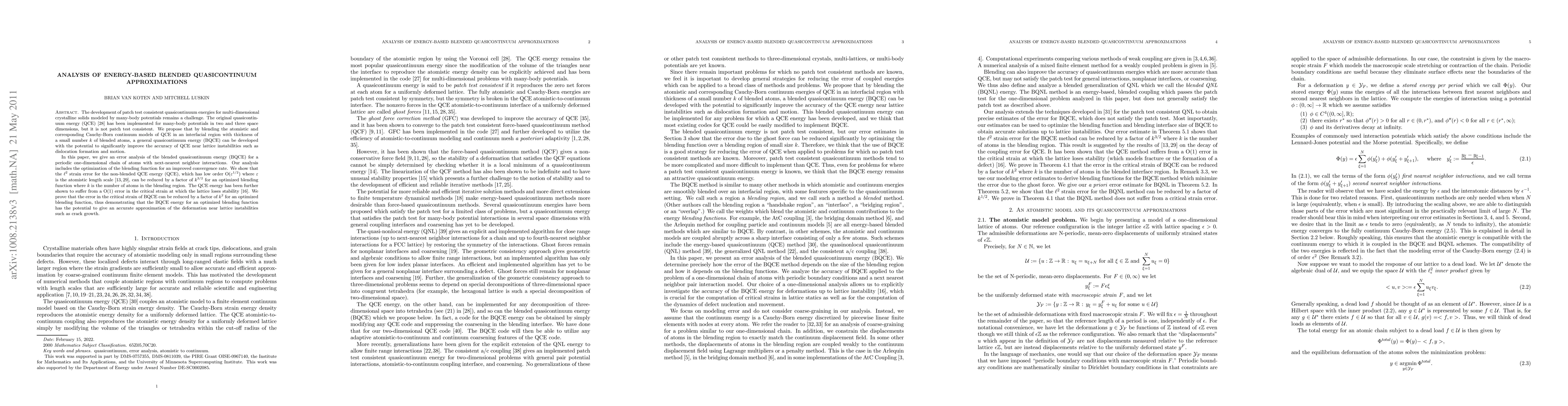 The development of patch test consistent quasicontinuum energies for multi-dimensional crystalline solids modeled by many-body potentials remains a challenge. The original quasicontinuum energy (QCE) has been implemented for many-body potentials in two and three space dimensions, but it is not patch test consistent. We propose that by blending the atomistic and corresponding Cauchy-Born continuum models of QCE in an interfacial region with thickness of a small number $k$ of blended atoms, a general quasicontinuum energy (BQCE) can be developed with the potential to significantly improve the accuracy of QCE near lattice instabilities such as dislocation formation and motion. In this paper, we give an error analysis of the blended quasicontinuum energy (BQCE) for a periodic one-dimensional chain of atoms with next-nearest neighbor interactions. Our analysis includes the optimization of the blending function for an improved convergence rate. We show that the $\ell^2$ strain error for the non-blended QCE energy (QCE), which has low order $\text{O}(\epsilon^{1/2})$ where $\epsilon$ is the atomistic length scale, can be reduced by a factor of $k^{3/2}$ for an optimized blending function where $k$ is the number of atoms in the blending region. The QCE energy has been further shown to suffer from a O$(1)$ error in the critical strain at which the lattice loses stability. We prove that the error in the critical strain of BQCE can be reduced by a factor of $k^2$ for an optimized blending function, thus demonstrating that the BQCE energy for an optimized blending function has the potential to give an accurate approximation of the deformation near lattice instabilities such as crack growth.