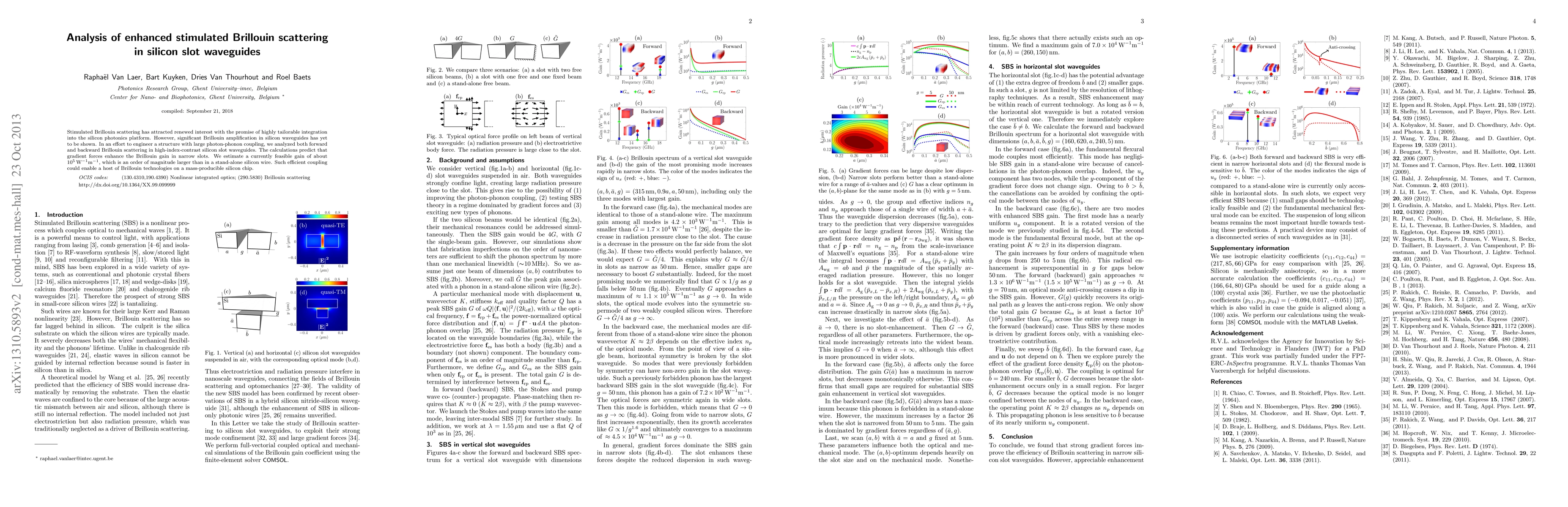 This research analyzes enhanced stimulated Brillouin scattering in silicon slot waveguides, predicting significant Brillouin gain due to gradient forces in narrow slots, with an estimated gain of $10^{5} \, \text{W}^{-1}\text{m}^{-1}$, which could facilitate advanced Brillouin technologies on silicon chips.