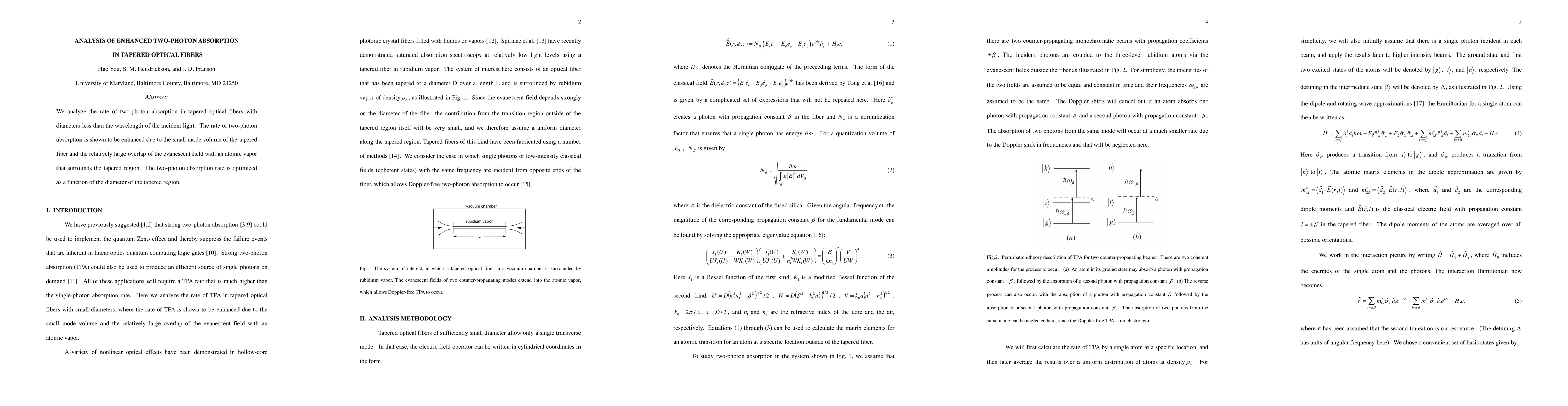 This study investigates the enhanced two-photon absorption in tapered optical fibers, demonstrating that the rate is significantly increased due to the reduced mode volume and improved evanescent field overlap with surrounding atomic vapor, with optimal absorption occurring at specific fiber diameters.