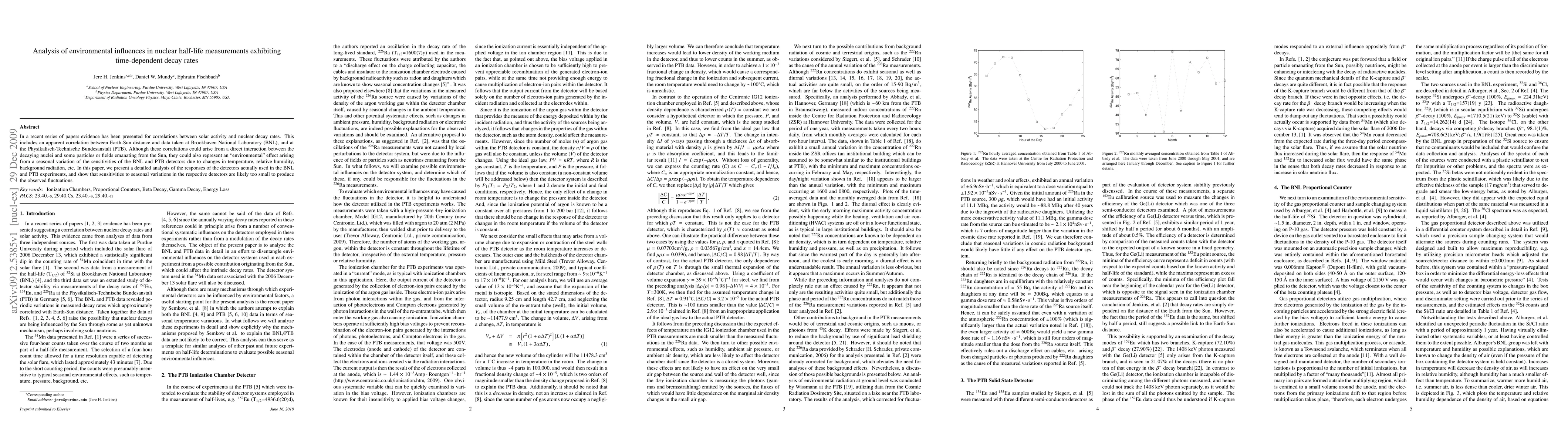 This paper investigates potential environmental influences on nuclear half-life measurements, finding no significant effect from seasonal variations in detector sensitivities at Brookhaven National Laboratory and PTB. It concludes that observed correlations with solar activity are unlikely to be due to environmental factors.