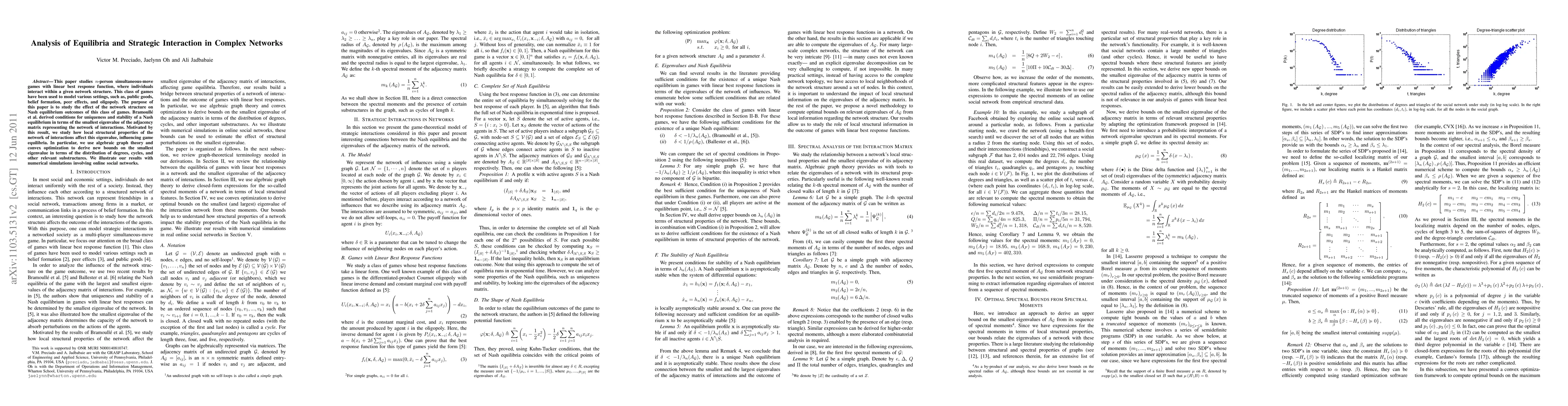 This paper studies $n$-person simultaneous-move games with linear best response function, where individuals interact within a given network structure. This class of games have been used to model various settings, such as, public goods, belief formation, peer effects, and oligopoly. The purpose of this paper is to study the effect of the network structure on Nash equilibrium outcomes of this class of games. Bramoull\'{e} et al. derived conditions for uniqueness and stability of a Nash equilibrium in terms of the smallest eigenvalue of the adjacency matrix representing the network of interactions. Motivated by this result, we study how local structural properties of the network of interactions affect this eigenvalue, influencing game equilibria. In particular, we use algebraic graph theory and convex optimization to derive new bounds on the smallest eigenvalue in terms of the distribution of degrees, cycles, and other relevant substructures. We illustrate our results with numerical simulations involving online social networks.