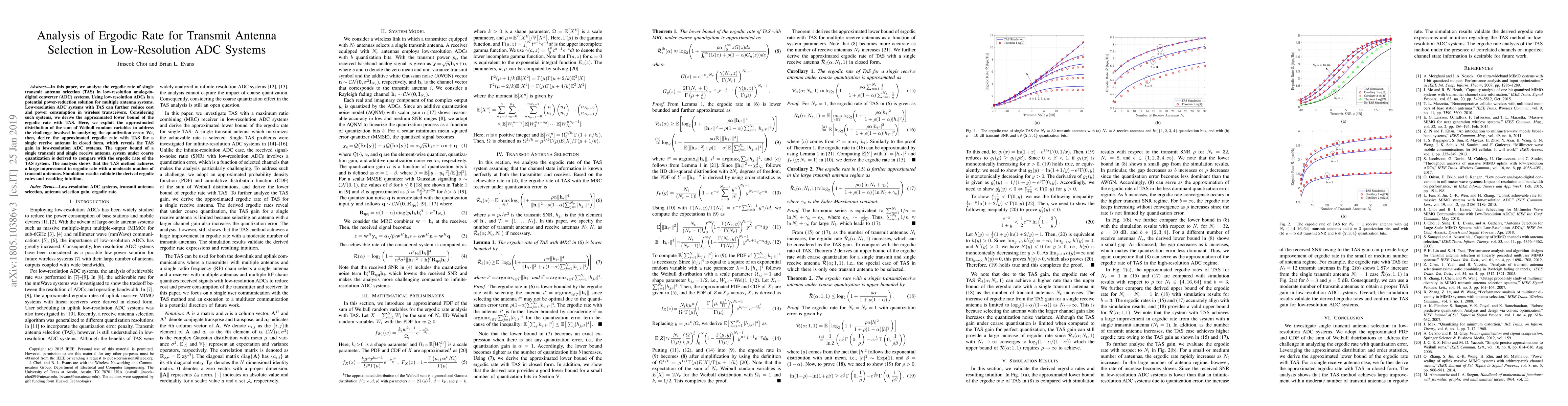 This paper analyzes the ergodic rate of single transmit antenna selection (TAS) in low-resolution ADC systems, deriving an approximated lower bound and showing significant rate improvement with moderate transmit antennas. Simulation results validate the theoretical findings.