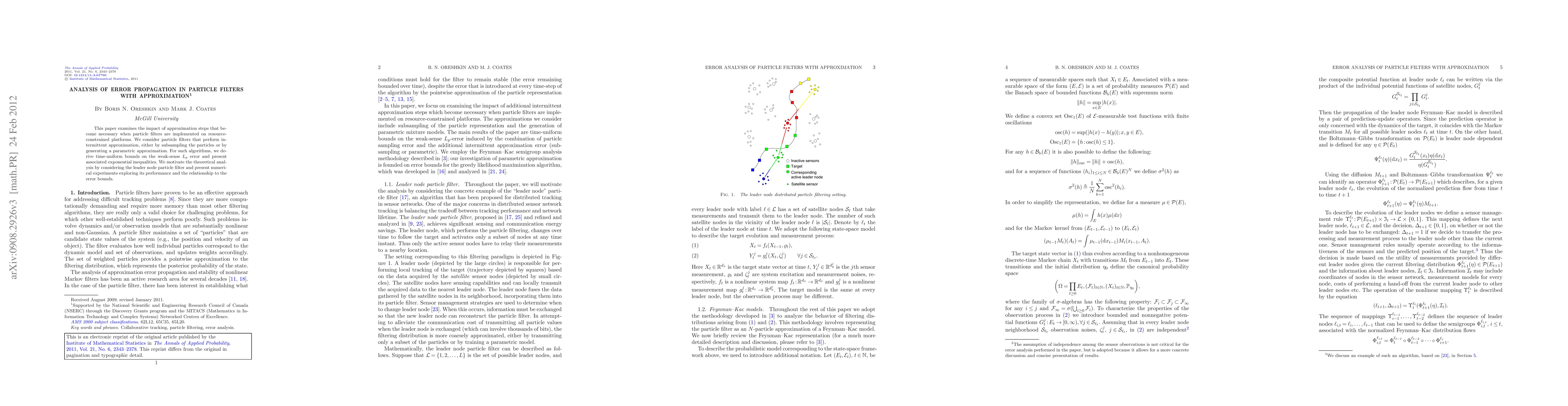 This paper analyzes error propagation in particle filters with approximation on resource-constrained platforms, deriving bounds on weak-sense $L_p$ error and presenting exponential inequalities for intermittent approximation methods.