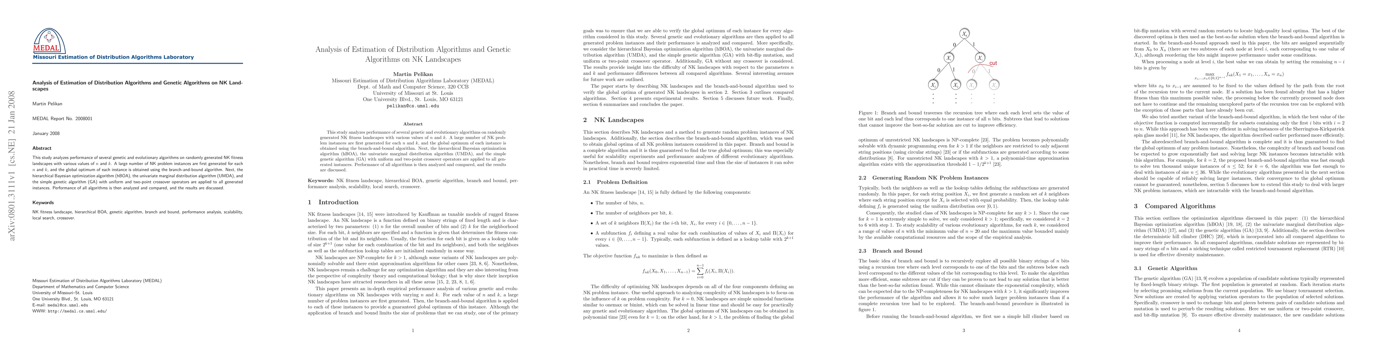 This study evaluates the performance of genetic and evolutionary algorithms, including hBOA, UMDA, and GA, on randomly generated NK landscapes with varying n and k values. The results of the algorithms are compared based on their ability to find global optima across numerous problem instances.