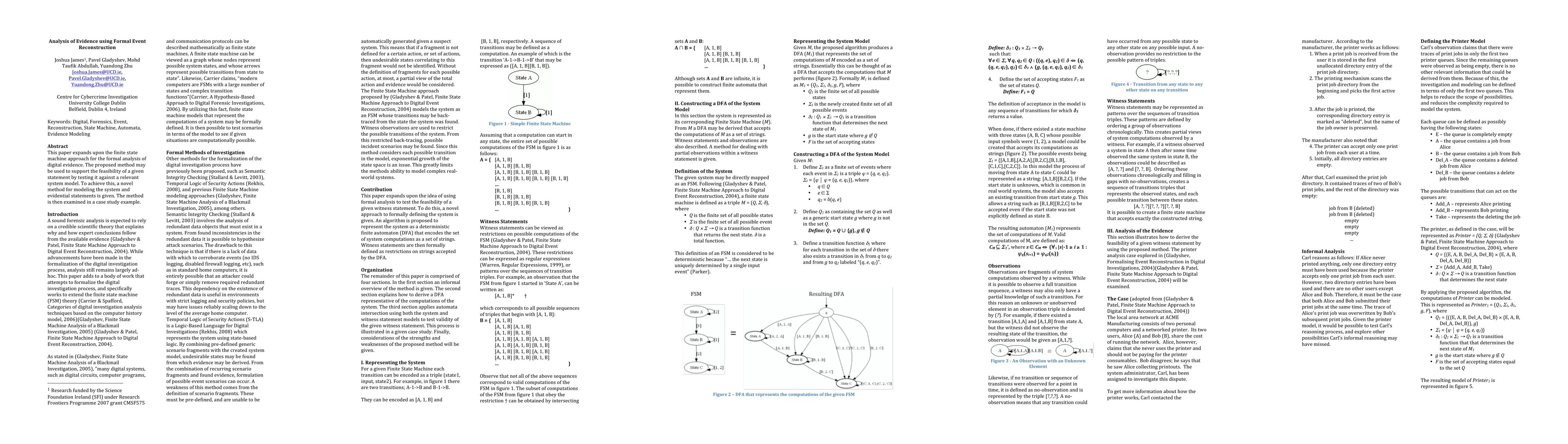 This paper expands upon the finite state machine approach for the formal analysis of digital evidence. The proposed method may be used to support the feasibility of a given statement by testing it against a relevant system model. To achieve this, a novel method for modeling the system and evidential statements is given. The method is then examined in a case study example.