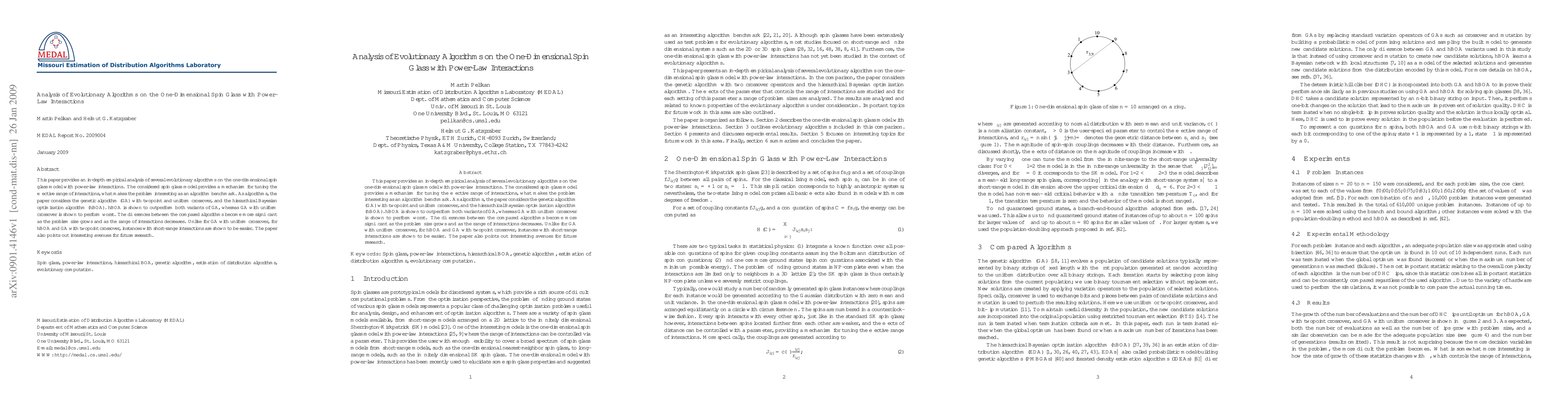 Evolutionary algorithms were analyzed on a one-dimensional spin glass model with power-law interactions, showing that hierarchical Bayesian optimization (hBOA) outperformed genetic algorithm variants, especially in larger problem sizes and shorter interaction ranges.