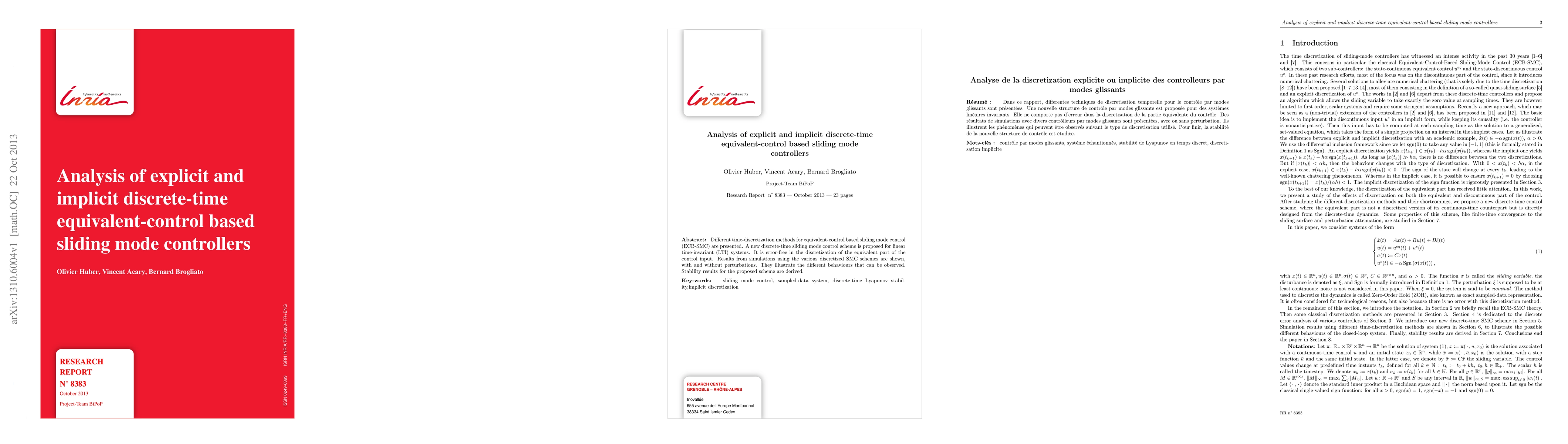 Different time-discretization methods for equivalent-control based sliding mode control (ECB-SMC) are presented. A new discrete-time sliding mode control scheme is proposed for linear time-invariant (LTI) systems. It is error-free in the discretization of the equivalent part of the control input. Results from simulations using the various discretized SMC schemes are shown, with and without perturbations. They illustrate the different behaviours that can be observed. Stability results for the proposed scheme are derived.