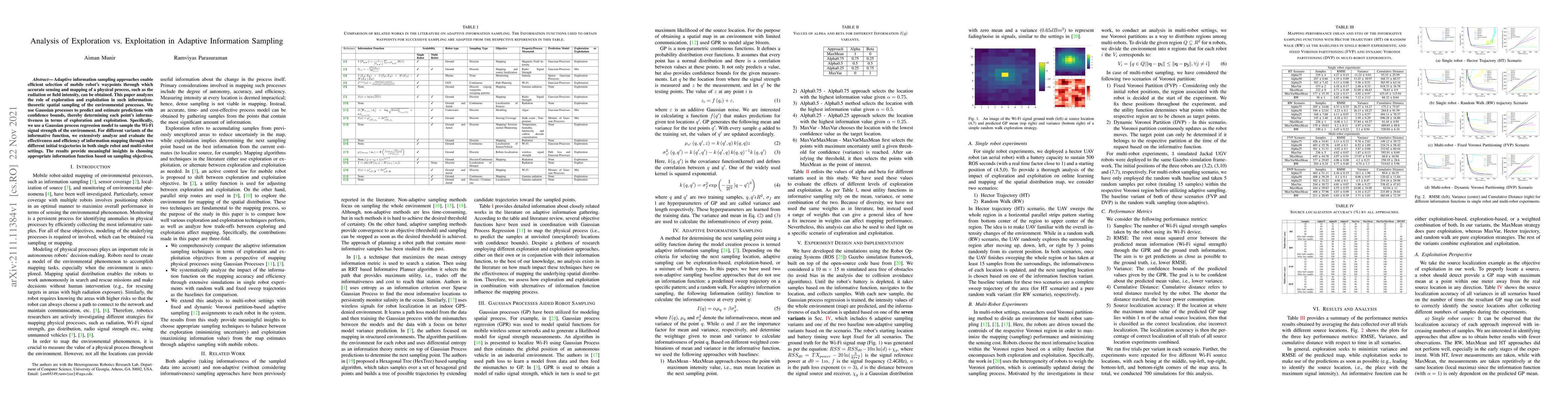Adaptive information sampling approaches enable efficient selection of mobile robot's waypoints through which accurate sensing and mapping of a physical process, such as the radiation or field intensity, can be obtained. This paper analyzes the role of exploration and exploitation in such information-theoretic spatial sampling of the environmental processes. We use Gaussian processes to predict and estimate predictions with confidence bounds, thereby determining each point's informativeness in terms of exploration and exploitation. Specifically, we use a Gaussian process regression model to sample the Wi-Fi signal strength of the environment. For different variants of the informative function, we extensively analyze and evaluate the effectiveness and efficiency of information mapping through two different initial trajectories in both single robot and multi-robot settings. The results provide meaningful insights in choosing appropriate information function based on sampling objectives.