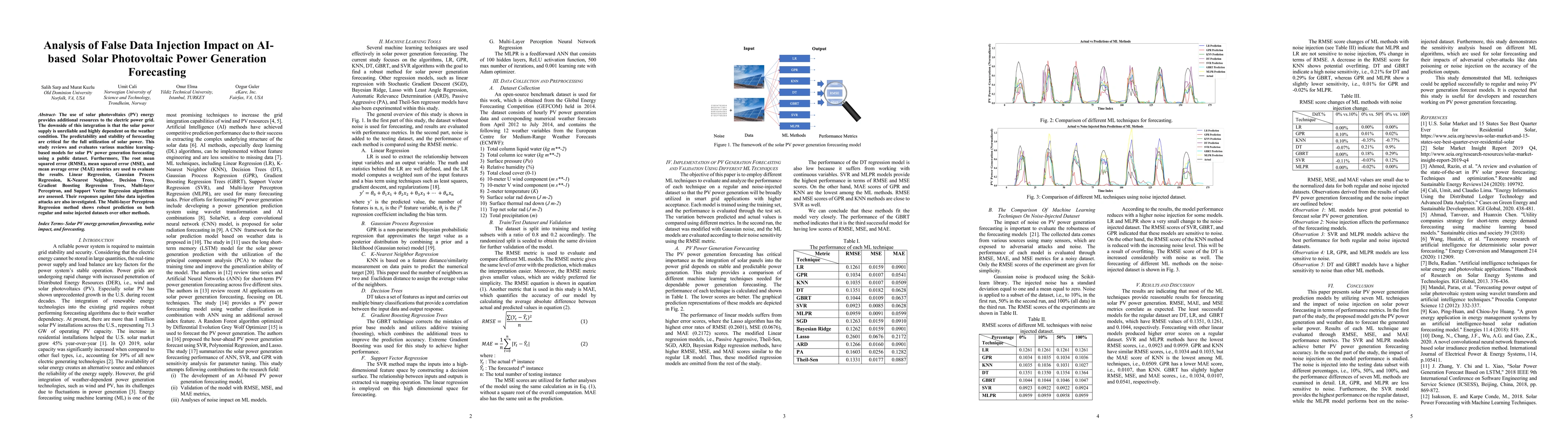 This study evaluates machine learning models for solar PV power generation forecasting, assessing their robustness against false data injection. The Multi-layer Perceptron Regression method demonstrates superior performance and resilience compared to other algorithms like Linear Regression and Gradient Boosting Regression Trees.