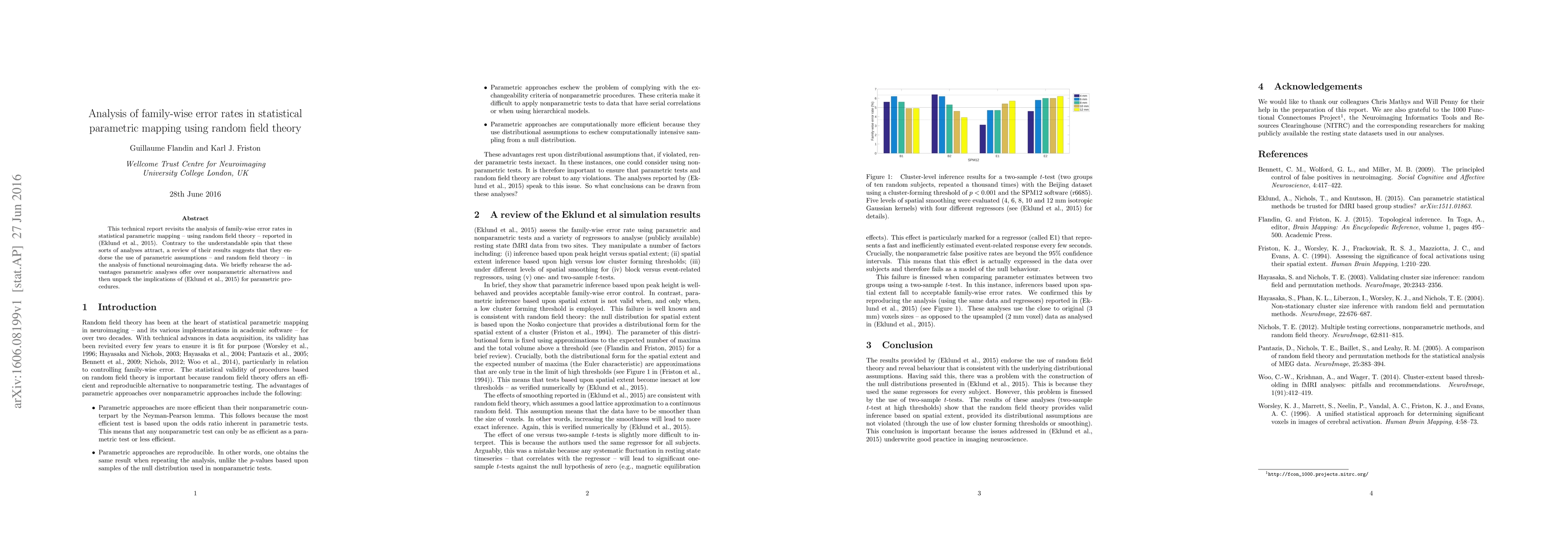 This technical report revisits the analysis of family-wise error rates in statistical parametric mapping - using random field theory - reported in (Eklund et al., 2015). Contrary to the understandable spin that these sorts of analyses attract, a review of their results suggests that they endorse the use of parametric assumptions - and random field theory - in the analysis of functional neuroimaging data. We briefly rehearse the advantages parametric analyses offer over nonparametric alternatives and then unpack the implications of (Eklund et al., 2015) for parametric procedures.