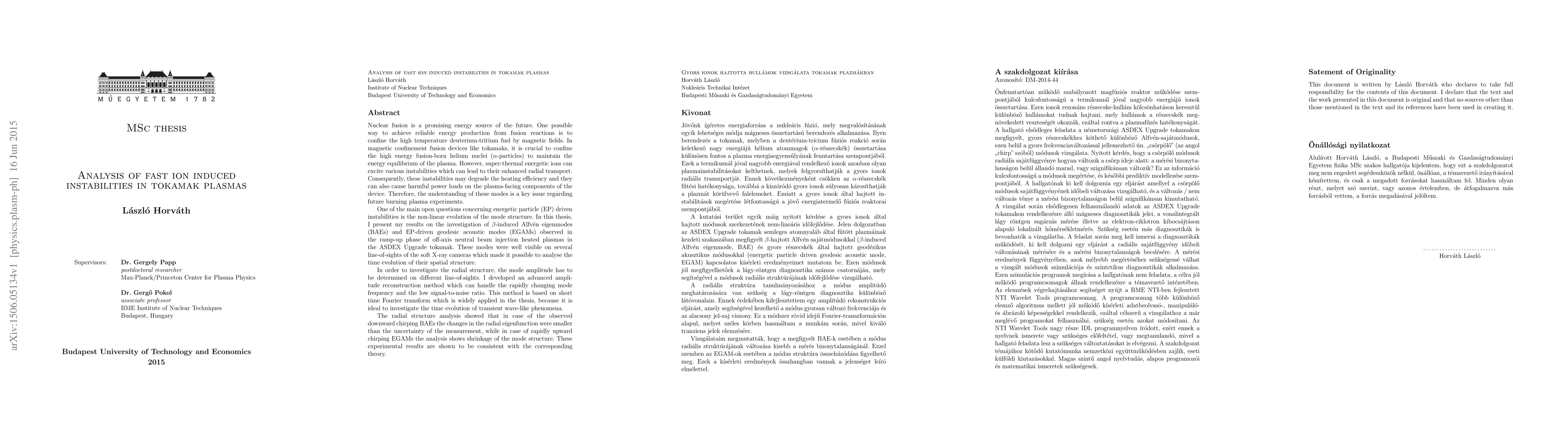 In magnetic confinement fusion devices like tokamaks, it is crucial to confine the high energy fusion-born helium nuclei ($\alpha$-particles) to maintain the energy equilibrium of the plasma. However, energetic ions can excite various instabilities which can lead to their enhanced radial transport. Consequently, these instabilities may degrade the heating efficiency and they can also cause harmful power loads on the plasma-facing components of the device. Therefore, the understanding of these modes is a key issue regarding future burning plasma experiments. One of the main open questions concerning energetic particle (EP) driven instabilities is the non-linear evolution of the mode structure. In this thesis, I present my results on the investigation of $\beta$-induced Alfv\'{e}n eigenmodes (BAEs) and EP-driven geodesic acoustic modes (EGAMs) observed in the ramp-up phase of off-axis NBI heated plasmas in the ASDEX Upgrade tokamak. These modes were well visible on several line-of-sights (LOSs) of the soft X-ray cameras which made it possible to analyse the time evolution of their spatial structure. In order to investigate the radial structure, the mode amplitude has to be determined on different LOSs. I developed an advanced amplitude reconstruction method which can handle the rapidly changing mode frequency and the low signal-to-noise ratio. This method is based on short time Fourier transform which is widely applied in the thesis, because it is ideal to investigate the time evolution of transient wave-like phenomena. The radial structure analysis showed that in case of the observed downward chirping BAEs the changes in the radial eigenfunction were smaller than the uncertainty of the measurement, while in case of rapidly upward chirping EGAMs the analysis shows shrinkage of the mode structure. These experimental results are shown to be consistent with the corresponding theory.
