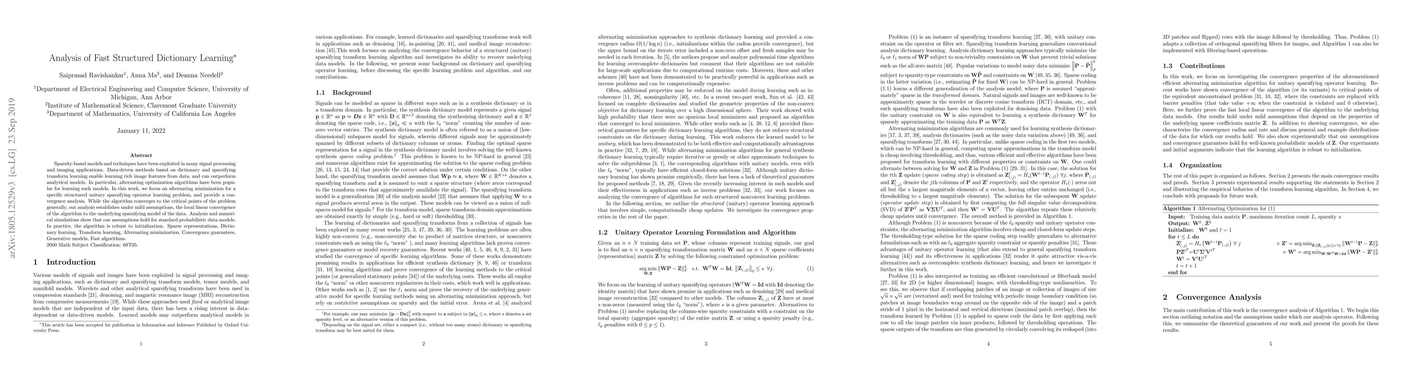 This paper analyzes an alternating optimization algorithm for learning structured unitary sparsifying operators in dictionary learning, demonstrating local linear convergence under mild assumptions. Numerical simulations confirm the algorithm's robustness and effectiveness for standard probabilistic data models.