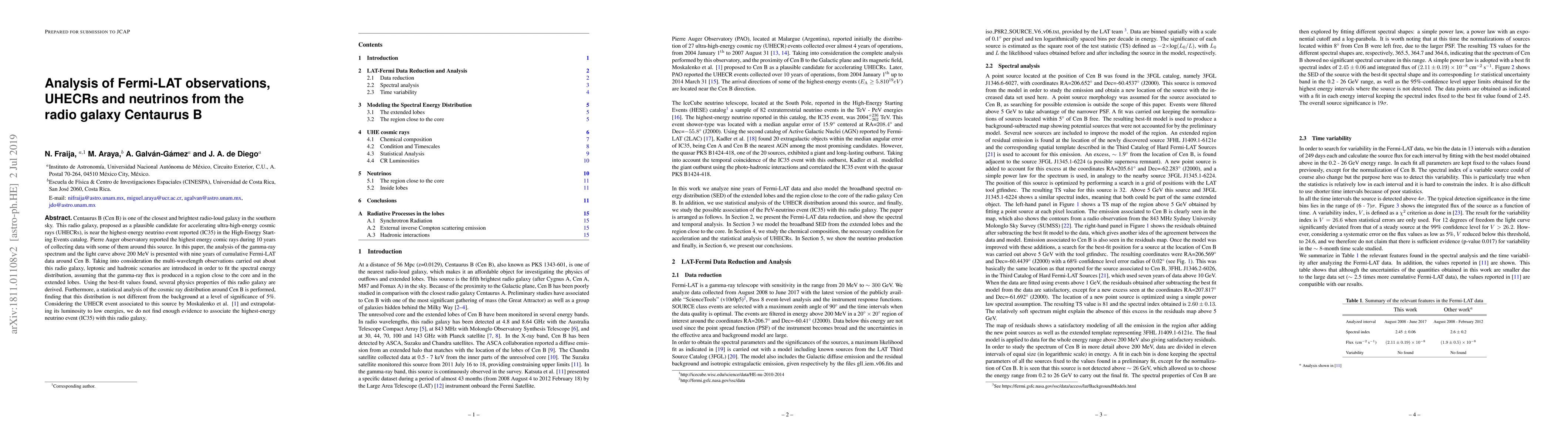 This paper analyzes nine years of Fermi-LAT observations of Centaurus B, a radio galaxy proposed as a candidate for UHECR acceleration, and finds no significant gamma-ray flux. It also concludes that the highest-energy neutrino event (IC35) is not likely associated with this source.