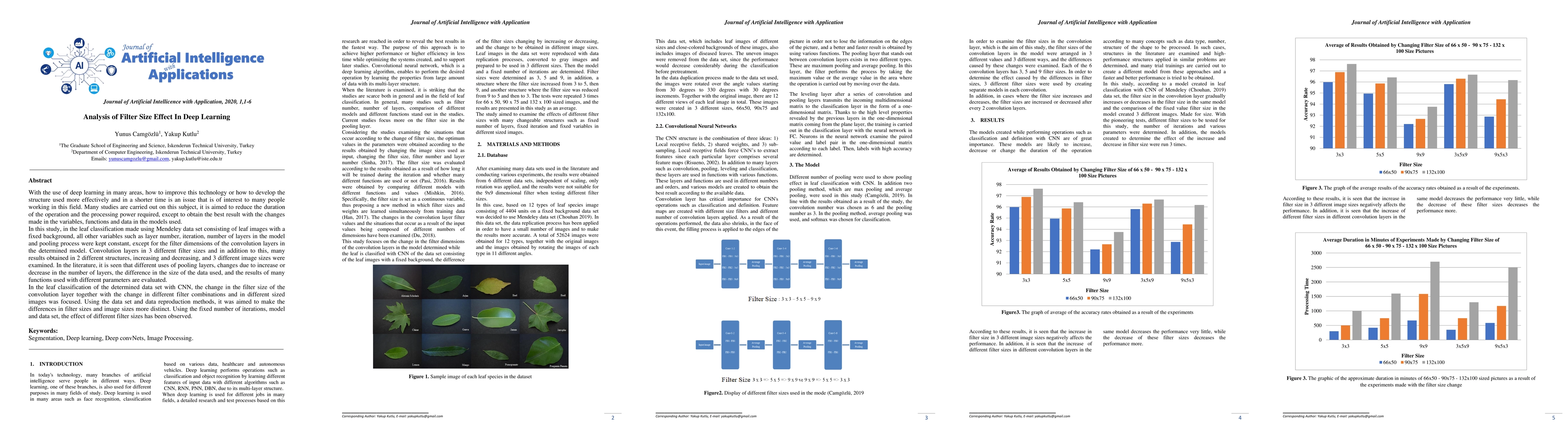 With the use of deep learning in many areas, how to improve this technology or how to develop the structure used more effectively and in a shorter time is an issue that is of interest to many people working in this field. Many studies are carried out on this subject, it is aimed to reduce the duration of the operation and the processing power required, except to obtain the best result with the changes made in the variables, functions and data in the models used. In this study, in the leaf classification made using Mendeley data set consisting of leaf images with a fixed background, all other variables such as layer number, iteration, number of layers in the model and pooling process were kept constant, except for the filter dimensions of the convolution layers in the determined model. Convolution layers in 3 different filter sizes and in addition to this, many results obtained in 2 different structures, increasing and decreasing, and 3 different image sizes were examined. In the literature, it is seen that different uses of pooling layers, changes due to increase or decrease in the number of layers, the difference in the size of the data used, and the results of many functions used with different parameters are evaluated. In the leaf classification of the determined data set with CNN, the change in the filter size of the convolution layer together with the change in different filter combinations and in different sized images was focused. Using the data set and data reproduction methods, it was aimed to make the differences in filter sizes and image sizes more distinct. Using the fixed number of iterations, model and data set, the effect of different filter sizes has been observed.