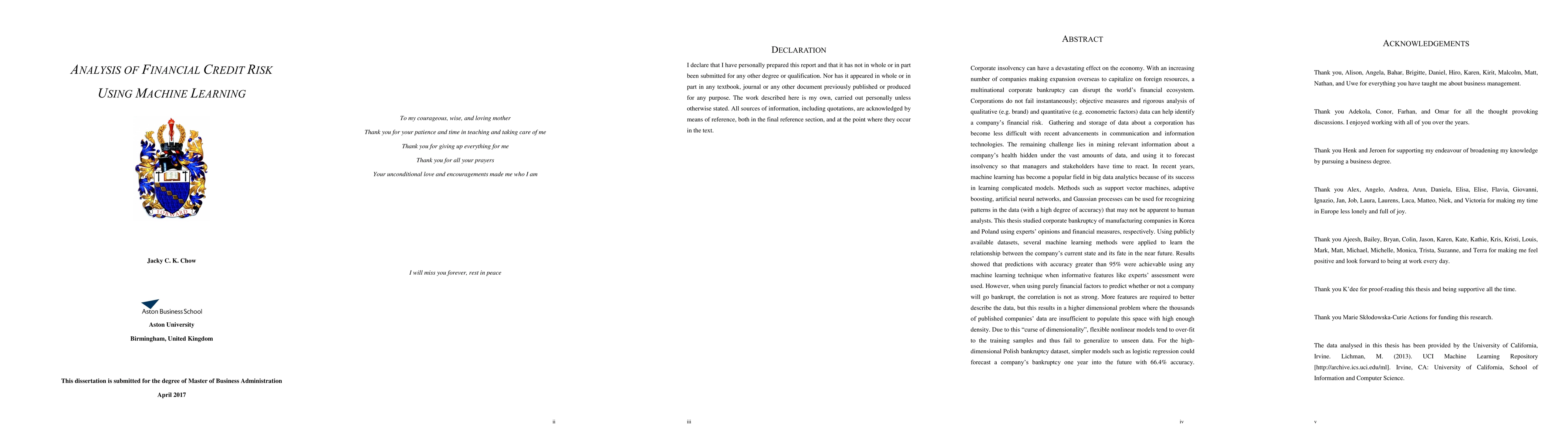 Corporate insolvency can have a devastating effect on the economy. With an increasing number of companies making expansion overseas to capitalize on foreign resources, a multinational corporate bankruptcy can disrupt the world's financial ecosystem. Corporations do not fail instantaneously; objective measures and rigorous analysis of qualitative (e.g. brand) and quantitative (e.g. econometric factors) data can help identify a company's financial risk. Gathering and storage of data about a corporation has become less difficult with recent advancements in communication and information technologies. The remaining challenge lies in mining relevant information about a company's health hidden under the vast amounts of data, and using it to forecast insolvency so that managers and stakeholders have time to react. In recent years, machine learning has become a popular field in big data analytics because of its success in learning complicated models. Methods such as support vector machines, adaptive boosting, artificial neural networks, and Gaussian processes can be used for recognizing patterns in the data (with a high degree of accuracy) that may not be apparent to human analysts. This thesis studied corporate bankruptcy of manufacturing companies in Korea and Poland using experts' opinions and financial measures, respectively. Using publicly available datasets, several machine learning methods were applied to learn the relationship between the company's current state and its fate in the near future. Results showed that predictions with accuracy greater than 95% were achievable using any machine learning technique when informative features like experts' assessment were used. However, when using purely financial factors to predict whether or not a company will go bankrupt, the correlation is not as strong.