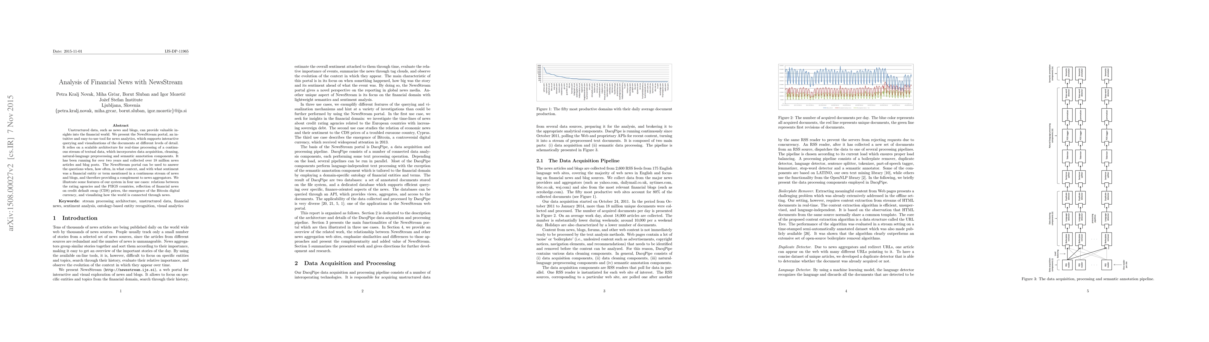 A new tool called NewsStream analyzes financial news in real-time, providing insights on entity mentions and sentiment analysis. It has collected over 18 million articles and can help answer questions about when and how financial entities are mentioned in the media.