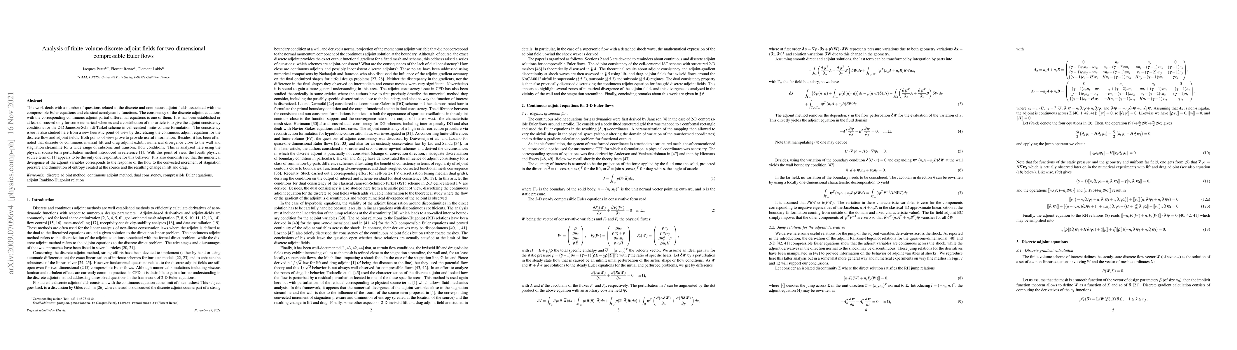 This work deals with a number of questions relative to the discrete and continuous adjoint fields associated with the compressible Euler equations and classical aerodynamic functions. The consistency of the discrete adjoint equations with the corresponding continuous adjoint partial differential equation is one of them. It is has been established or at least discussed only for a handful of numerical schemes and a contribution of this article is to give the adjoint consistency conditions for the 2D Jameson-Schmidt-Turkel scheme in cell-centred finite-volume formulation. The consistency issue is also studied here from a new heuristic point of view by discretizing the continuous adjoint equation for the discrete flow and adjoint fields. Both points of view prove to provide useful information. Besides, it has been often noted that discrete or continuous inviscid lift and drag adjoint exhibit numerical divergence close to the wall and stagnation streamline for a wide range of subsonic and transonic flow conditions. This is analyzed here using the physical source term perturbation method introduced in reference [Giles and Pierce, AIAA Paper 97-1850, 1997]. With this point of view, the fourth physical source term of appears to be the only one responsible for this behavior. It is also demonstrated that the numerical divergence of the adjoint variables corresponds to the response of the flow to the convected increment of stagnation pressure and diminution of entropy created at the source and the resulting change in lift and drag.