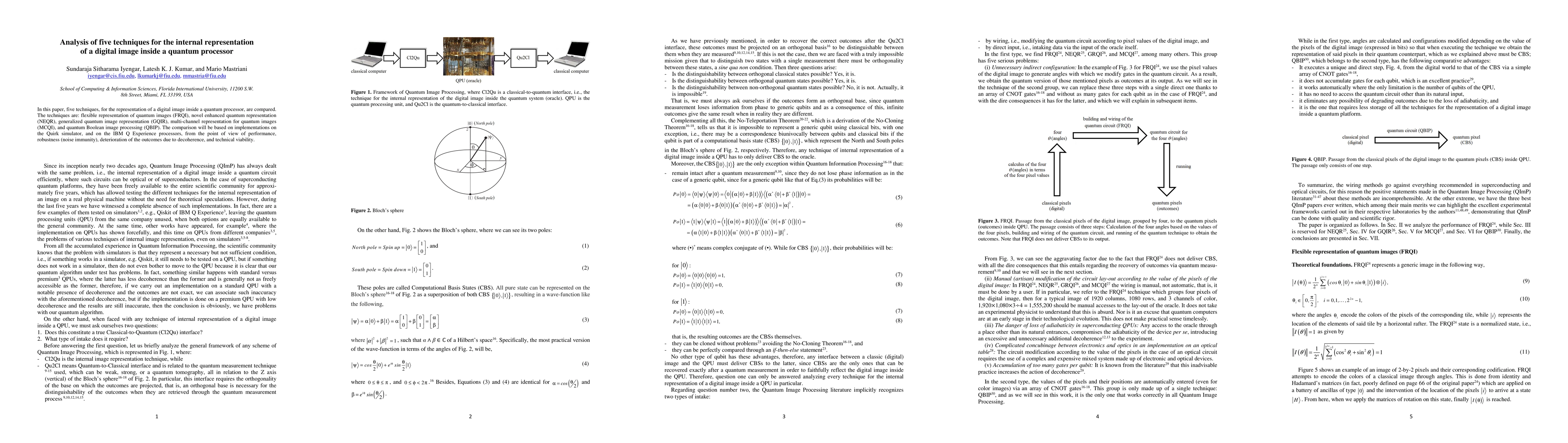 In this paper, five techniques, for the representation of a digital image inside a quantum processor, are compared. The techniques are: flexible representation of quantum images (FRQI), novel enhanced quantum representation (NEQR), generalized quantum image representation (GQIR), multi-channel representation for quantum images (MCQI), and quantum Boolean image processing (QBIP). The comparison will be based on implementations on the Quirk simulator, and on the IBM Q Experience processors, from the point of view of performance, robustness (noise immunity), deterioration of the outcomes due to decoherence, and technical viability.