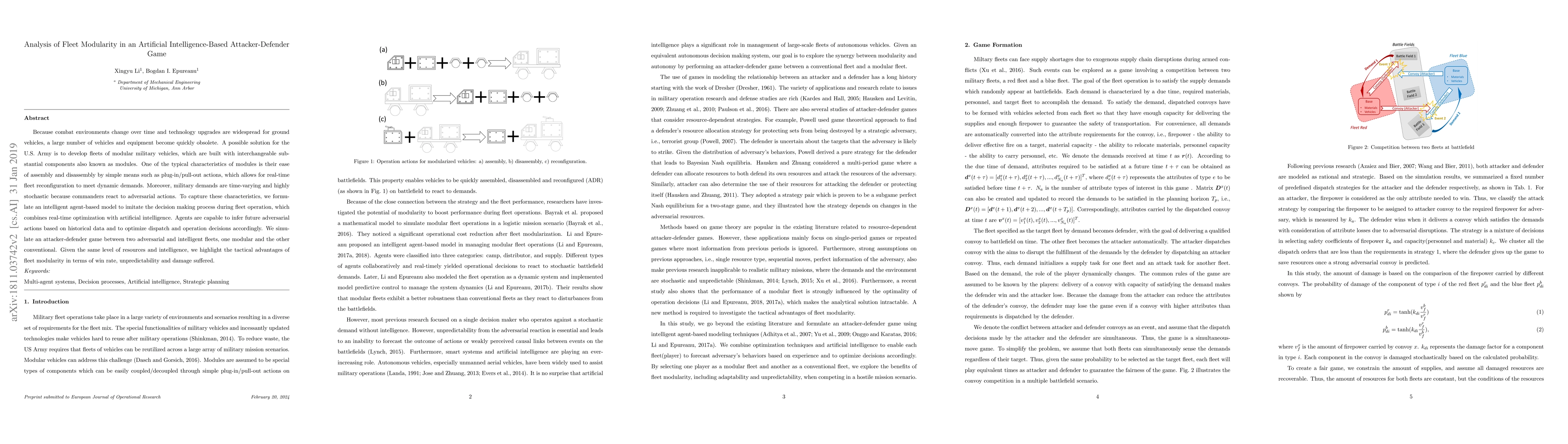 This paper analyzes the tactical advantages of modular military vehicle fleets using an AI-based attacker-defender game model. It highlights how fleet modularity enhances win rate, unpredictability, and damage reduction compared to conventional fleets through real-time optimization and adaptive reconfiguration.