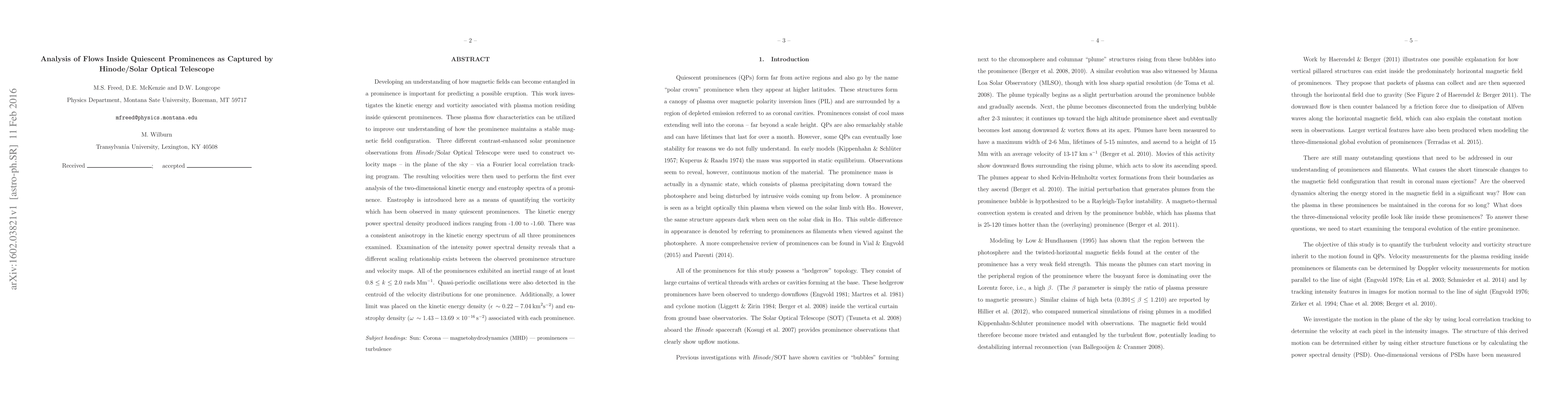 Researchers analyzed flows inside quiescent prominences using Hinode/Solar Optical Telescope data, finding consistent anisotropy in kinetic energy spectra and quasi-periodic oscillations in velocity distributions.