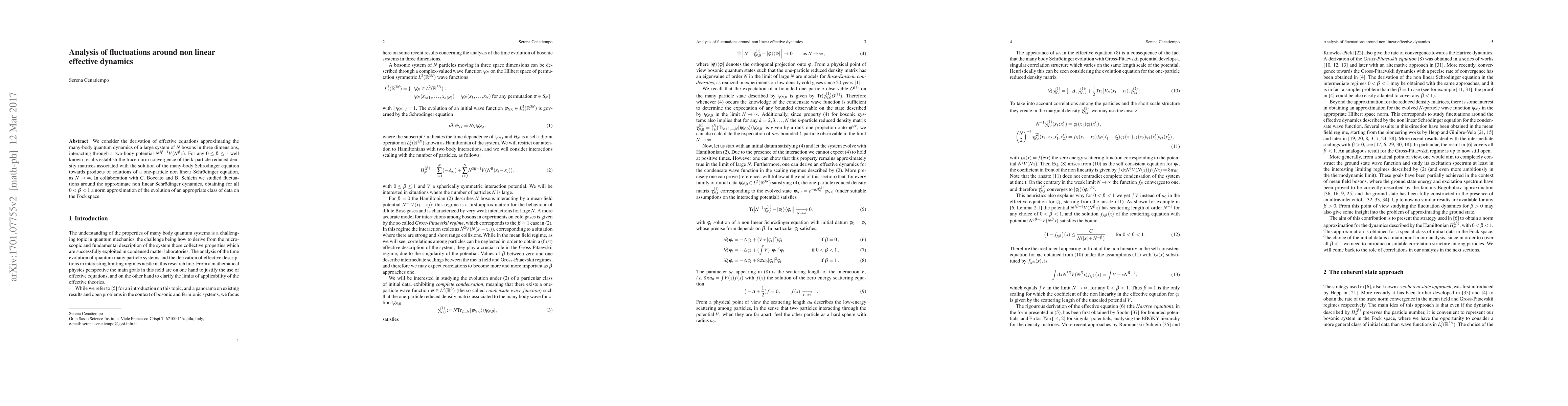 We consider the derivation of effective equations approximating the many-body quantum dynamics of a large system of $N$ bosons in three dimensions, interacting through a two-body potential $N^{3\beta-1}V(N^\beta x)$. For any $0 \leq \beta \leq 1$ well known results establish the trace norm convergence of the k-particle reduced density matrices associated with the solution of the many-body Schr\"odinger equation towards products of solutions of a one-particle non linear Schr\"odinger equation, as $N \to \infty$. In collaboration with C. Boccato and B. Schlein we studied fluctuations around the approximate non linear Schr\"odinger dynamics, obtaining for all $0 < \beta < 1$ a norm approximation of the evolution of an appropriate class of data on the Fock space.