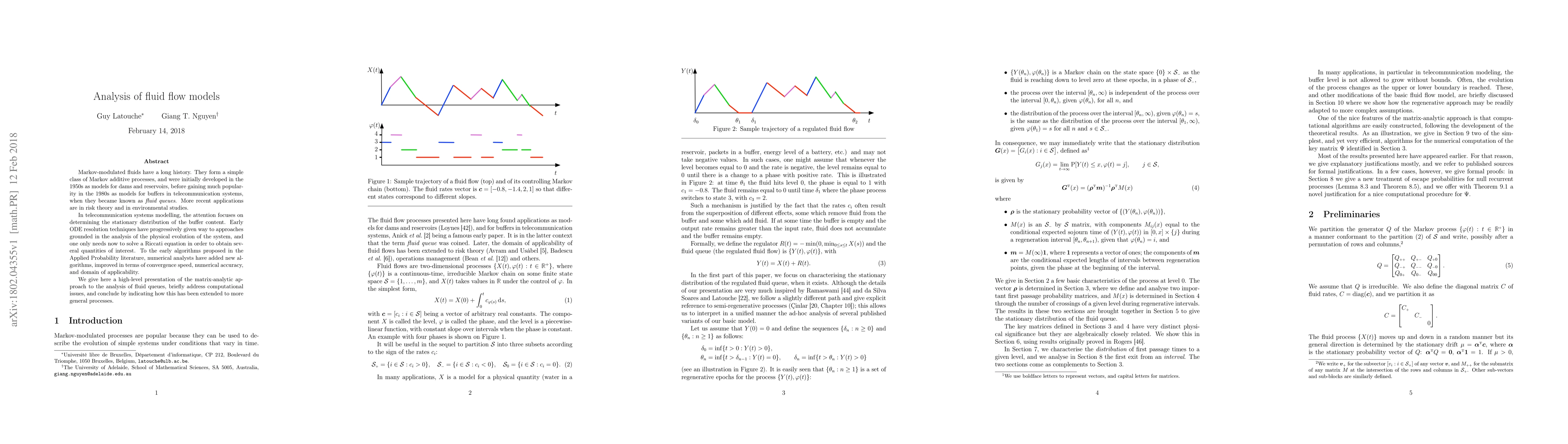 Markov-modulated fluids have a long history. They form a simple class of Markov additive processes, and were initially developed in the 1950s as models for dams and reservoirs, before gaining much popularity in the 1980s as models for buffers in telecommunication systems, when they became known as fluid queues. More recent applications are in risk theory and in environmental studies. In telecommunication systems modelling, the attention focuses on determining the stationary distribution of the buffer content. Early ODE resolution techniques have progressively given way to approaches grounded in the analysis of the physical evolution of the system, and one only needs now to solve a Riccati equation in order to obtain several quantities of interest. To the early algorithms proposed in the Applied Probability literature, numerical analysts have added new algorithms, improved in terms of convergence speed, numerical accuracy, and domain of applicability. We give here a high-level presentation of the matrix-analytic approach to the analysis of fluid queues, briefly address computational issues, and conclude by indicating how this has been extended to more general processes.