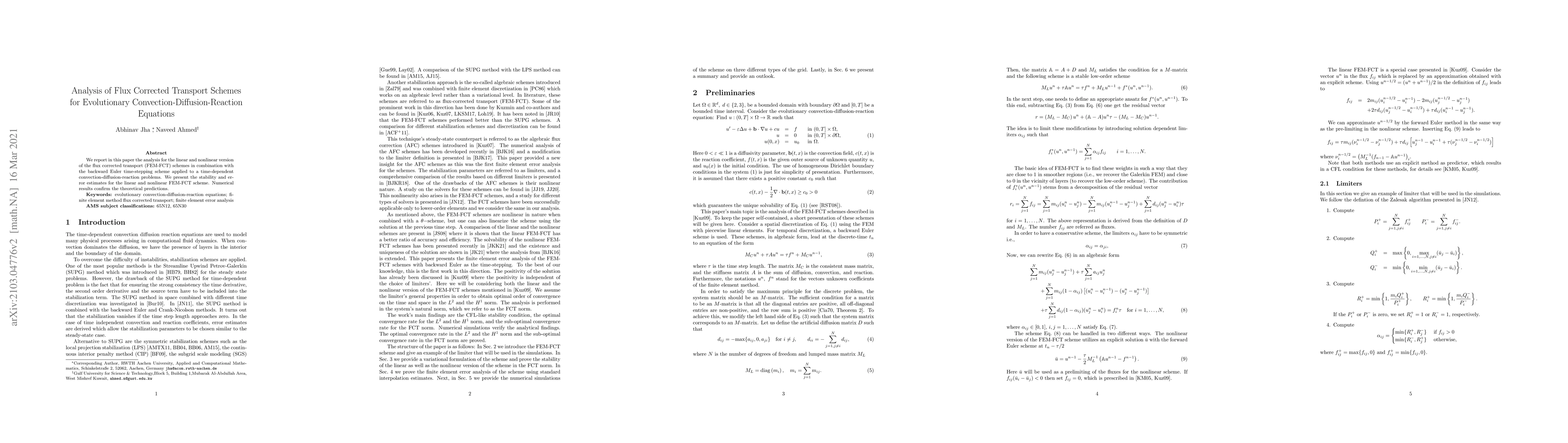 We report in this paper the analysis for the linear and nonlinear version of the flux corrected transport (FEM-FCT) scheme in combination with the backward Euler time-stepping scheme applied to time-dependent convection-diffusion-reaction problems. We present the stability and error estimates for the linear and nonlinear FEM-FCT scheme. Numerical results confirm the theoretical predictions.