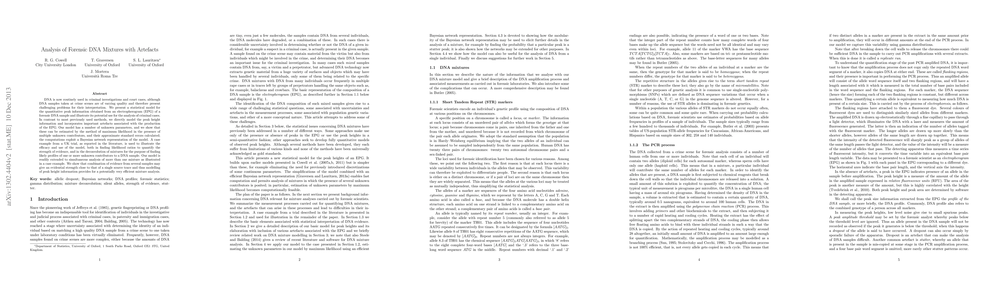 This paper presents a statistical model for analyzing forensic DNA mixtures, directly modeling peak height information from electropherograms and incorporating artefacts. The model estimates parameters via maximum likelihood and Bayesian networks, demonstrating its efficacy through a UK trial case example and showing potential for efficient mixture analysis.