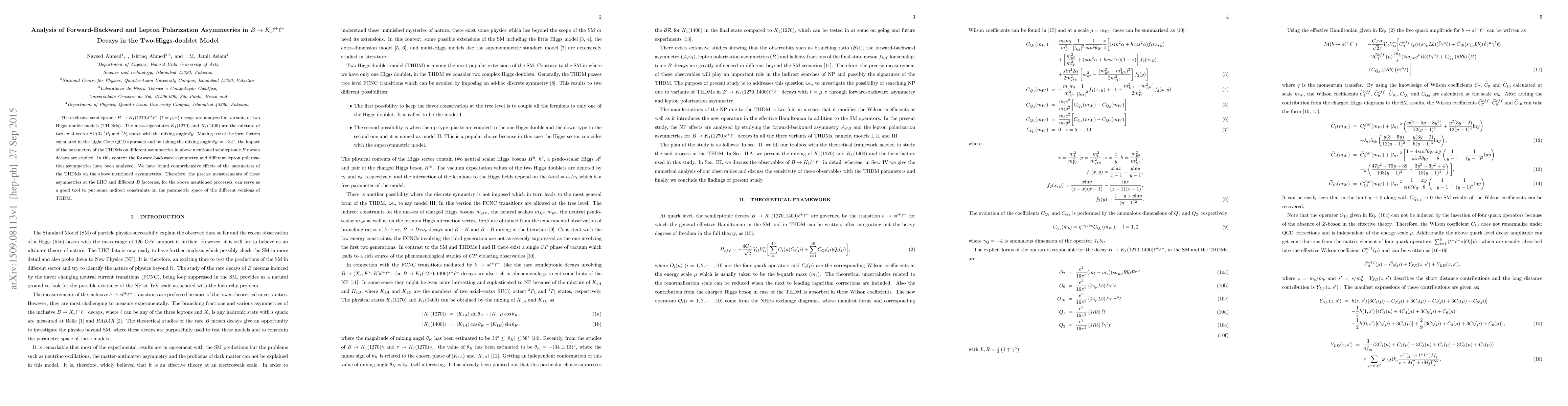 This paper analyzes the forward-backward and lepton polarization asymmetries in $B\to K_{1}\ell^{+}\ell^{-}$ decays within two-Higgs-doublet models, using form factors from the Light Cone QCD approach. It finds significant effects of THDM parameters on these asymmetries, suggesting that precise measurements at the LHC and $B$ factories could indirectly constrain THDM parameter spaces.