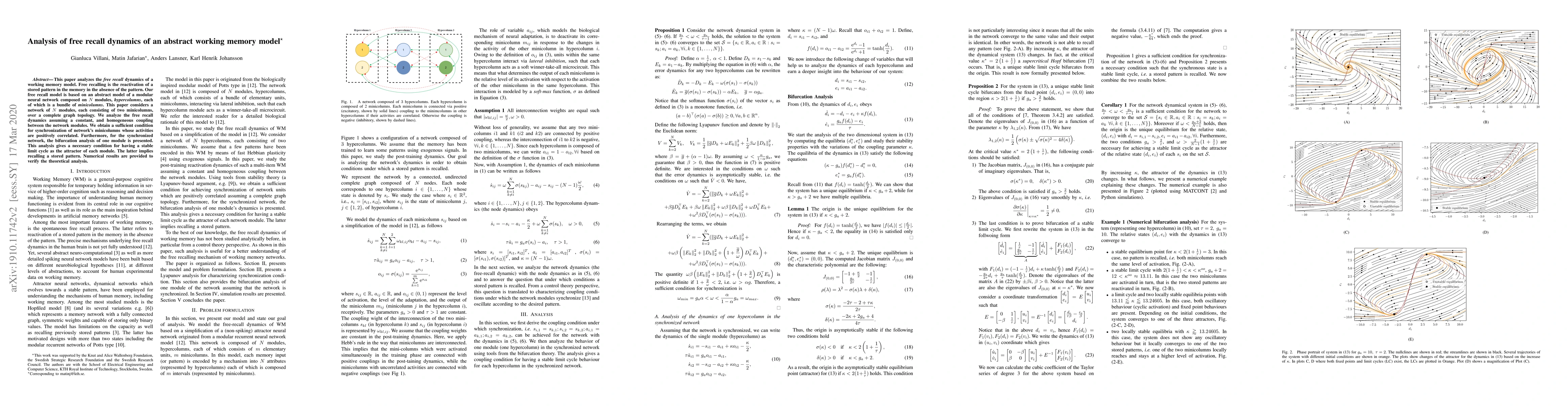 This paper analyzes the free recall dynamics of a working memory model. Free recalling is the reactivation of a stored pattern in the memory in the absence of the pattern. Our free recall model is based on an abstract model of a modular neural network composed on $N$ modules, hypercolumns, each of which is a bundle of minicolumns. This paper considers a network of $N$ modules, each consisting of two minicolumns, over a complete graph topology. We analyze the free recall dynamics assuming a constant, and homogeneous coupling between the network modules. We obtain a sufficient condition for synchronization of network's minicolumns whose activities are positively correlated. Furthermore, for the synchronized network, the bifurcation analysis of one module is presented. This analysis gives a necessary condition for having a stable limit cycle as the attractor of each module. The latter implies recalling a stored pattern. Numerical results are provided to verify the theoretical analysis.