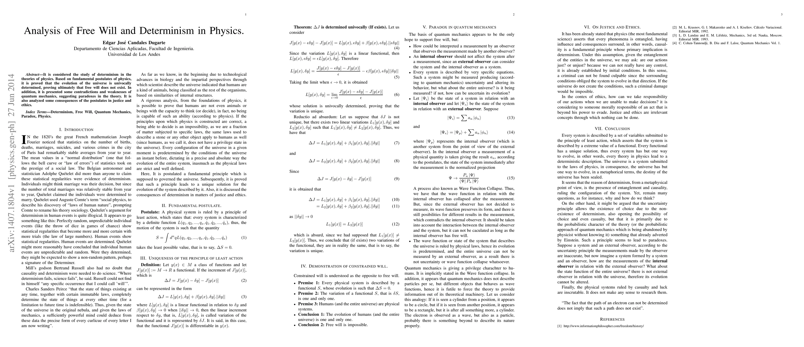 It is considered the study of determinism in the theories of physics. Based on fundamental postulates of physics, it is proved that the evolution of the universe is univocally determined, proving ultimately that free will does not exist. In addition, it is presented some contradictions and weaknesses of quantum mechanics, suggesting paradoxes in the theory. It is also analyzed some consequences of the postulates in justice and ethics.
