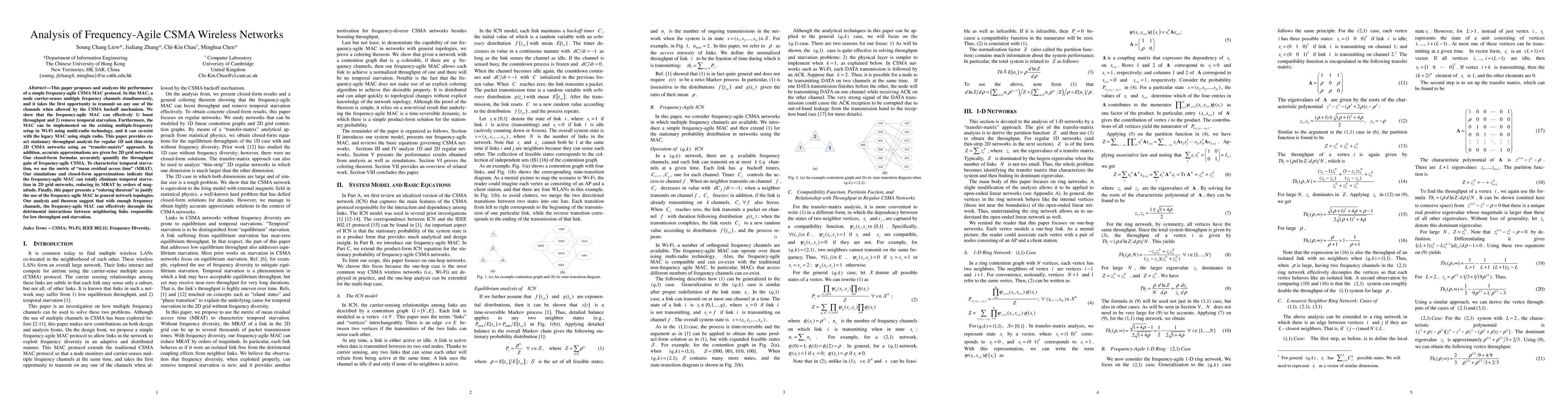 This paper proposes a frequency-agile CSMA MAC protocol that enhances throughput and eliminates temporal starvation by allowing nodes to transmit on any available frequency channel. It provides exact and approximate throughput analysis, demonstrating significant throughput gains and reduced mean residual access time in 2D grid networks.