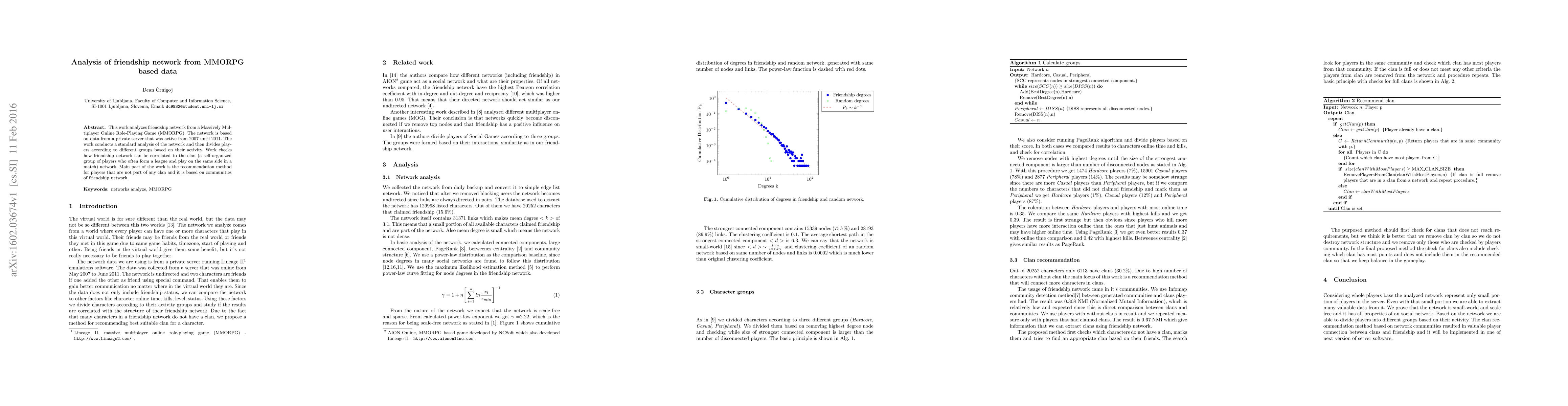 This work analyzes friendship network from a Massively Multiplayer Online Role-Playing Game (MMORPG). The network is based on data from a private server that was active from 2007 until 2011. The work conducts a standard analysis of the network and then divides players according to different groups based on their activity. Work checks how friendship network can be correlated to the clan (a self-organized group of players who often form a league and play on the same side in a match) network. Main part of the work is the recommendation method for players that are not part of any clan and it is based on communities of friendship network.
