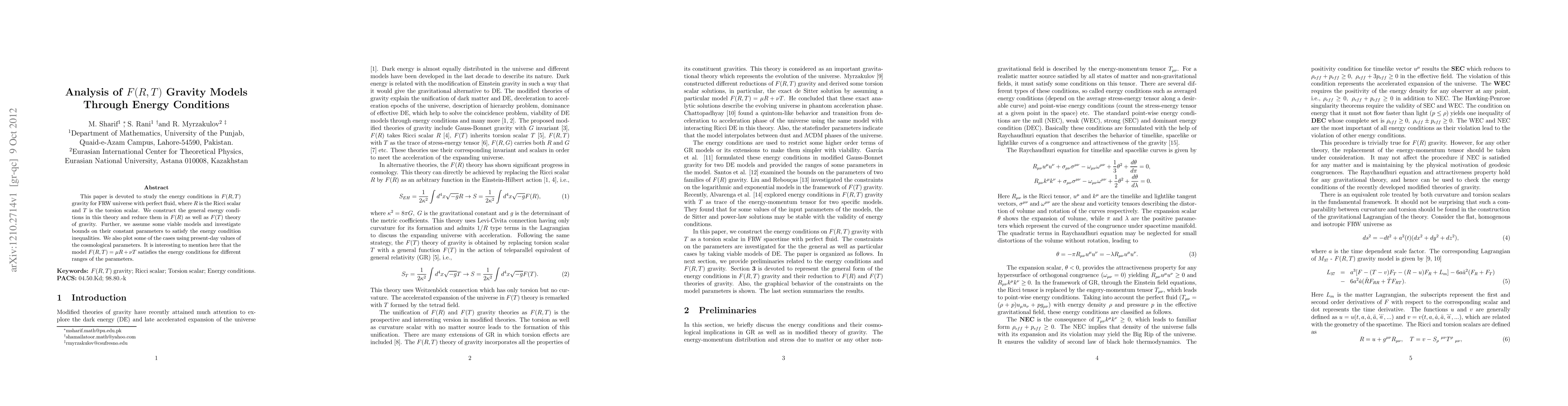 This paper is devoted to study the energy conditions in F(R,T) gravity for FRW universe with perfect fluid, where $R$ is the Ricci scalar and $T$ is the torsion scalar. We construct the general energy conditions in this theory and reduce them in F(R) as well as F(T) theory of gravity. Further, we assume some viable models and investigate bounds on their constant parameters to satisfy the energy condition inequalities. We also plot some of the cases using present-day values of the cosmological parameters. It is interesting to mention here that the model F(R,T)=\mu R+ \nu T satisfies the energy conditions for different ranges of the parameters.