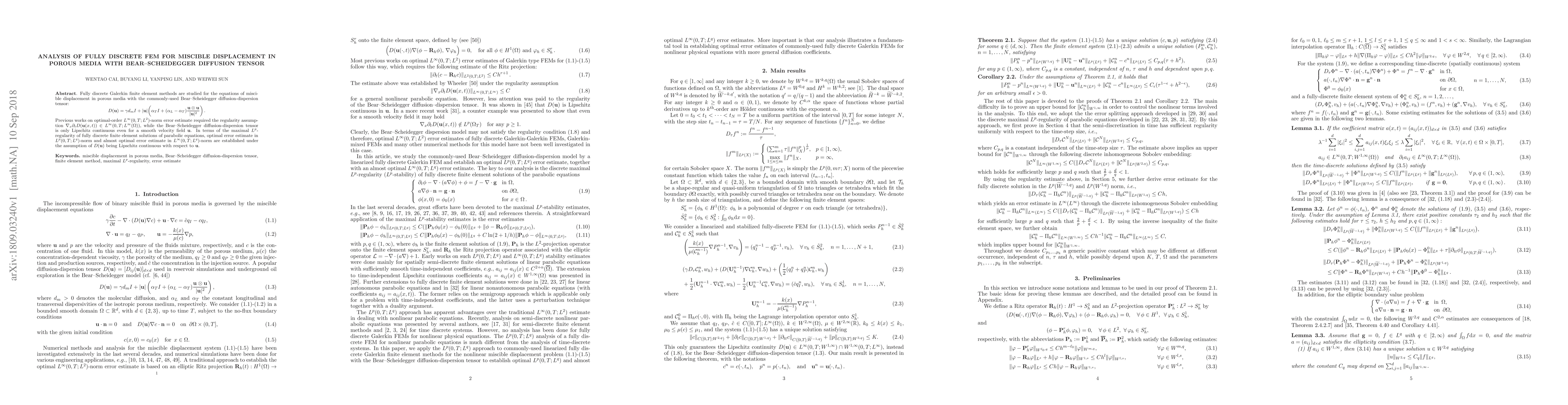 Fully discrete Galerkin finite element methods are studied for the equations of miscible displacement in porous media with the commonly-used Bear--Scheidegger diffusion-dispersion tensor: $$ D({\bf u}) = \gamma d_m I + |{\bf u}|\bigg( \alpha_T I + (\alpha_L - \alpha_T) \frac{{\bf u} \otimes {\bf u}}{|{\bf u}|^2}\bigg) \, . $$ Previous works on optimal-order $L^\infty(0,T;L^2)$-norm error estimate required the regularity assumption $\nabla_x\partial_tD({\bf u}(x,t)) \in L^\infty(0,T;L^\infty(\Omega))$, while the Bear--Scheidegger diffusion-dispersion tensor is only Lipschitz continuous even for a smooth velocity field ${\bf u}$. In terms of the maximal $L^p$-regularity of fully discrete finite element solutions of parabolic equations, optimal error estimate in $L^p(0,T;L^q)$-norm and almost optimal error estimate in $L^\infty(0,T;L^q)$-norm are established under the assumption of $D({\bf u})$ being Lipschitz continuous with respect to ${\bf u}$.