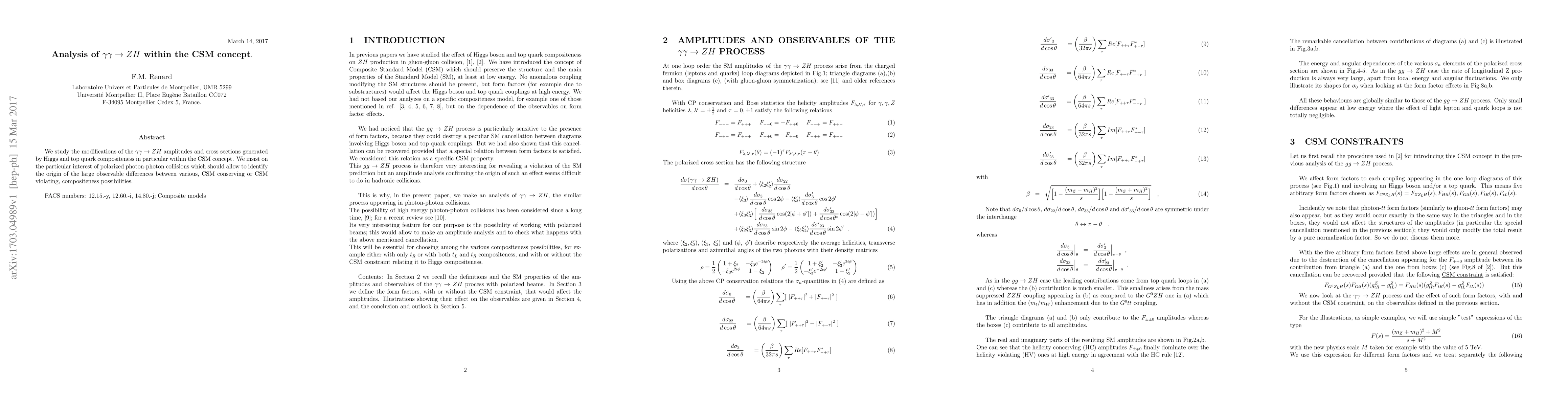 We study the modifications of the $\gamma\gamma\to ZH$ amplitudes and cross sections generated by Higgs and top quark compositeness in particular within the CSM concept. We insist on the particular interest of polarized photon-photon collisions which should allow to identify the origin of the large observable differences between various, CSM conserving or CSM violating, compositeness possibilities.