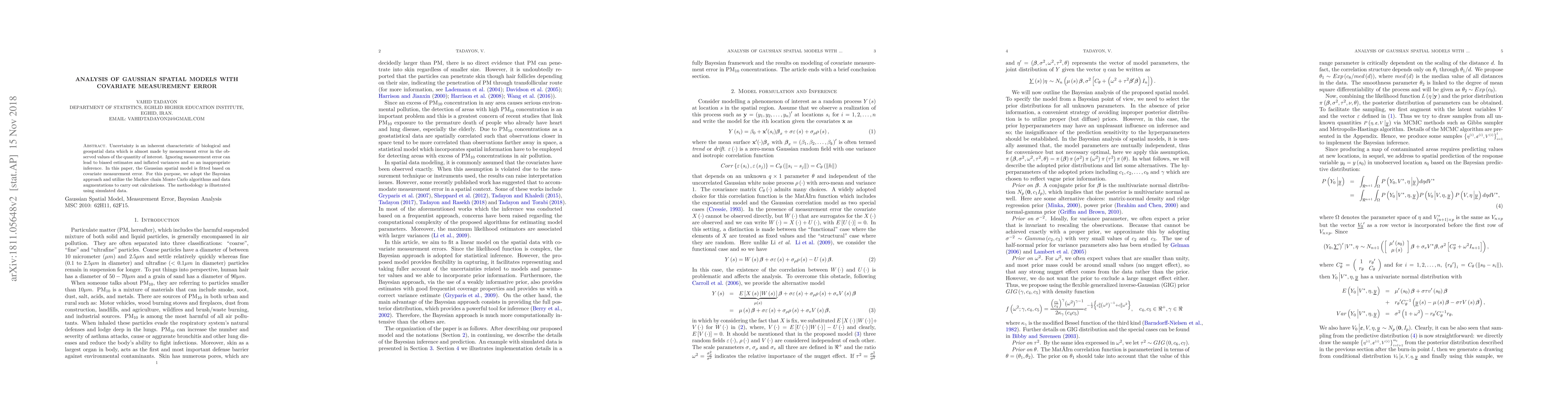 This paper develops a Bayesian approach to fit Gaussian spatial models that account for covariate measurement error, employing Markov chain Monte Carlo algorithms and data augmentations. The methodology is demonstrated through simulated data to illustrate its effectiveness in reducing bias and variance in estimates.