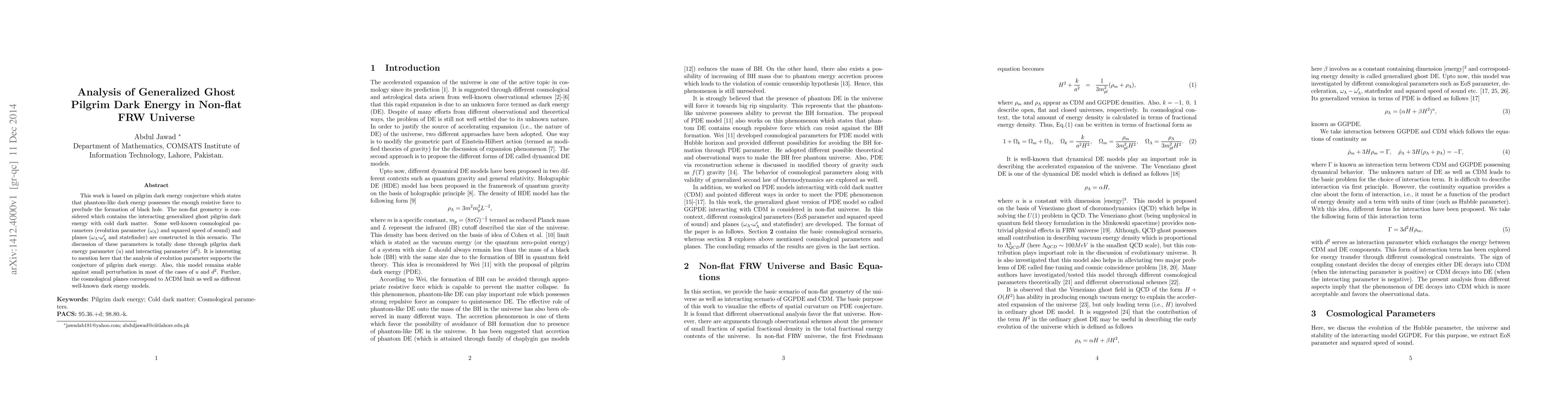 This work is based on pilgrim dark energy conjecture which states that phantom-like dark energy possesses the enough resistive force to preclude the formation of black hole. The non-flat geometry is considered which contains the interacting generalized ghost pilgrim dark energy with cold dark matter. Some well-known cosmological parameters (evolution parameter ($\omega_{\Lambda}$) and squared speed of sound) and planes ($\omega_{\Lambda}$-$\omega_{\Lambda}'$ and statefinder) are constructed in this scenario. The discussion of these parameters is totally done through pilgrim dark energy parameter ($u$) and interacting parameter ($d^2$). It is interesting to mention here that the analysis of evolution parameter supports the conjecture of pilgrim dark energy. Also, this model remains stable against small perturbation in most of the cases of $u$ and $d^2$. Further, the cosmological planes correspond to $\Lambda$CDM limit as well as different well-known dark energy models.