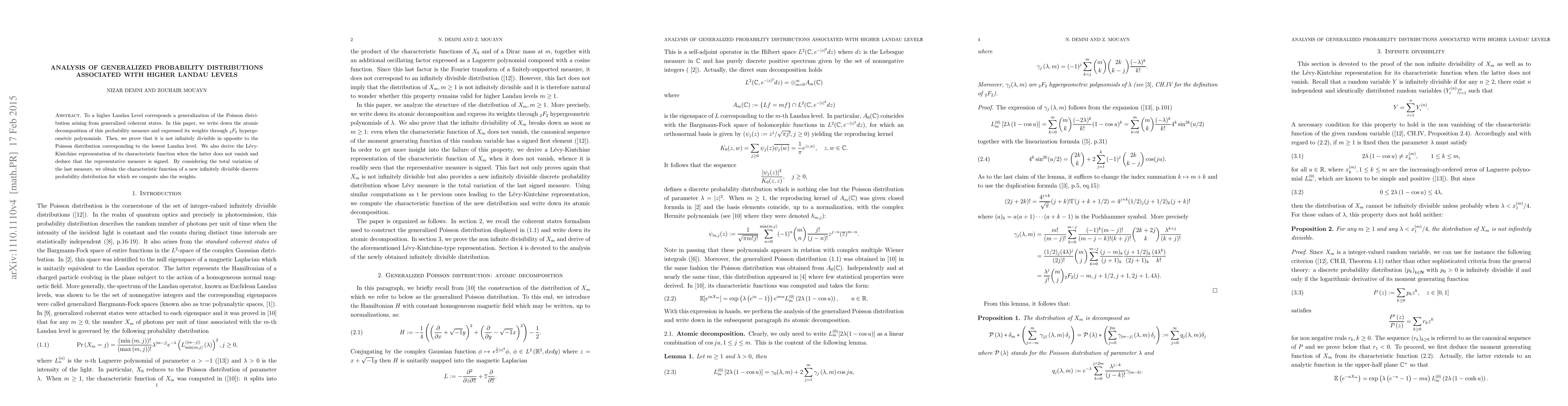To a higher Landau Level corresponds a generalization of the Poisson distribution arising from generalized coherent states. In this paper, we write down the atomic decomposition of this probability measure and expressed its weights through 2F2 hypergeometric polynomials. Then, we prove that it is not infinitely divisible in opposite to the Poisson distribution corresponding to the lowest Landau level. We also derive the Levy-Kintchine representation of its characteristic function when the latter does not vanish and deduce that the representative measure is signed. By considering the total variation of the last measure, we obtain the characteristic function of a new infinitely divisible discrete probability distribution for which we compute also the weights.