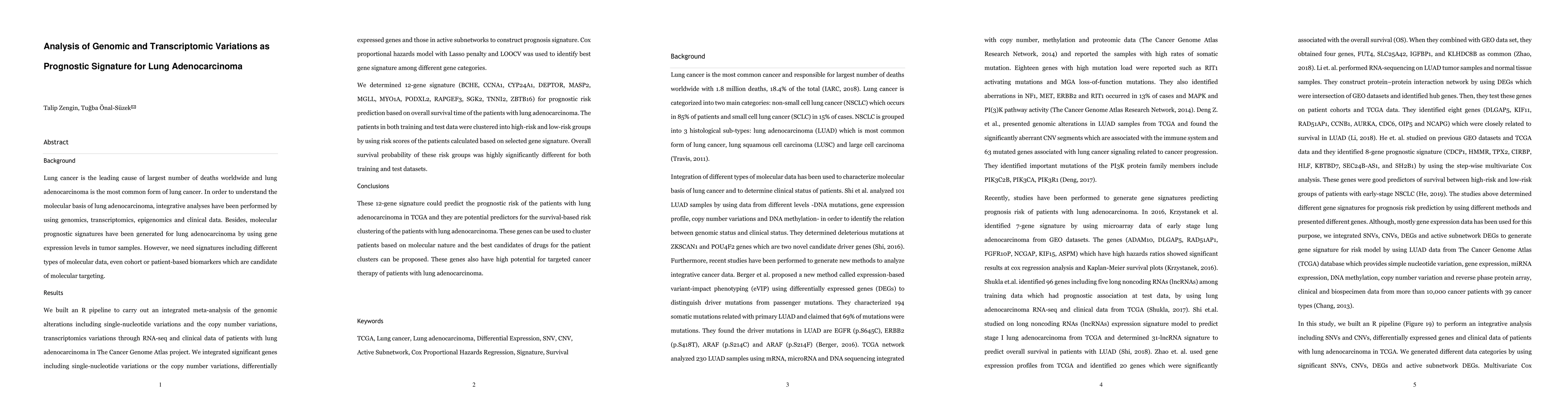 Lung cancer is the leading cause of the largest number of deaths worldwide and lung adenocarcinoma (LUAD) is the most common form of lung cancer. In this study, we carried out an integrated meta-analysis of the mutations including single-nucleotide variations (SNVs), the copy number variations (CNVs), RNA-seq and clinical data of patients with LUAD downloaded from The Cancer Genome Atlas (TCGA). We integrated significant SNV and CNV genes, differentially expressed genes (DEGs) and the DEGs in active subnetworks to construct a prognosis signature. Cox proportional hazards model (LOOCV) with Lasso penalty was used to identify the best gene signature among different gene categories. The patients in both training and test data were clustered into high-risk and low-risk groups by using risk scores of the patients calculated based on selected gene signature. We generated a 12-gene signature (DEPTOR, ZBTB16, BCHE, MGLL, MASP2, TNNI2, RAPGEF3, SGK2, MYO1A, CYP24A1, PODXL2, CCNA1) for overall survival prediction. The survival time of high-risk and low-risk groups was significantly different. This 12-gene signature could predict prognosis and they are potential predictors for the survival of the patients with LUAD.