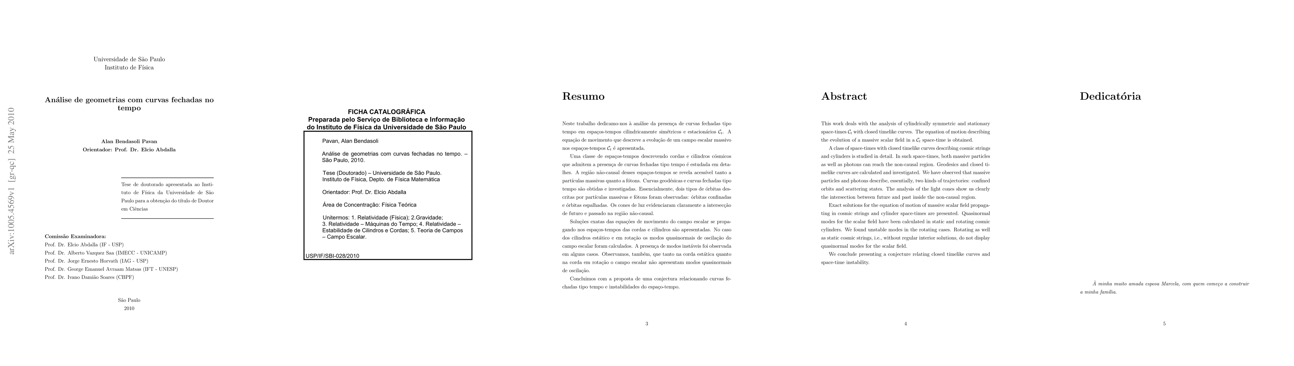 This work deals with the analysis of cylindrically symmetric and stationary space-times $\mathcal{C}_{t}$ with closed timelike curves. The equation of motion describing the evolution of a massive scalar field in a $\mathcal{C}_{t}$ space-time is obtained. A class of space-times with closed timelike curves describing cosmic strings and cylinders is studied in detail. In such space-times, both massive particles as well as photons can reach the non-causal region. Geodesics and closed timelike curves are calculated and investigated. We have observed that massive particles and photons describe, essentially, two kinds of trajectories: confined orbits and scattering states. The analysis of the light cones show us clearly the intersection between future and past inside the non-causal region. Exact solutions for the equation of motion of massive scalar field propagating in cosmic strings and cylinder space-times are presented. Quasinormal modes for the scalar field have been calculated in static and rotating cosmic cylinders. We found unstable modes in the rotating cases. Rotating as well as static cosmic strings, i.e., without regular interior solutions, do not display quasinormal modes for the scalar field. We conclude presenting a conjecture relating closed timelike curves and space-time instability.