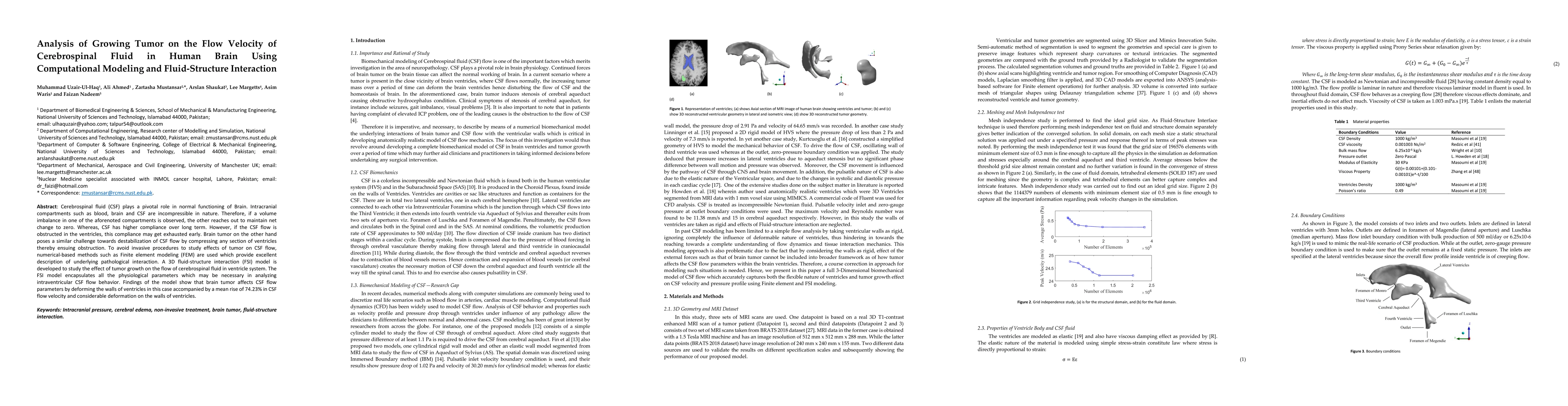 This study uses computational modeling and fluid-structure interaction to analyze how tumor growth affects cerebrospinal fluid (CSF) flow in the human brain. The findings reveal a significant increase in CSF flow velocity and deformation of ventricle walls due to tumor compression, highlighting the potential of non-invasive numerical methods for understanding such pathological interactions.