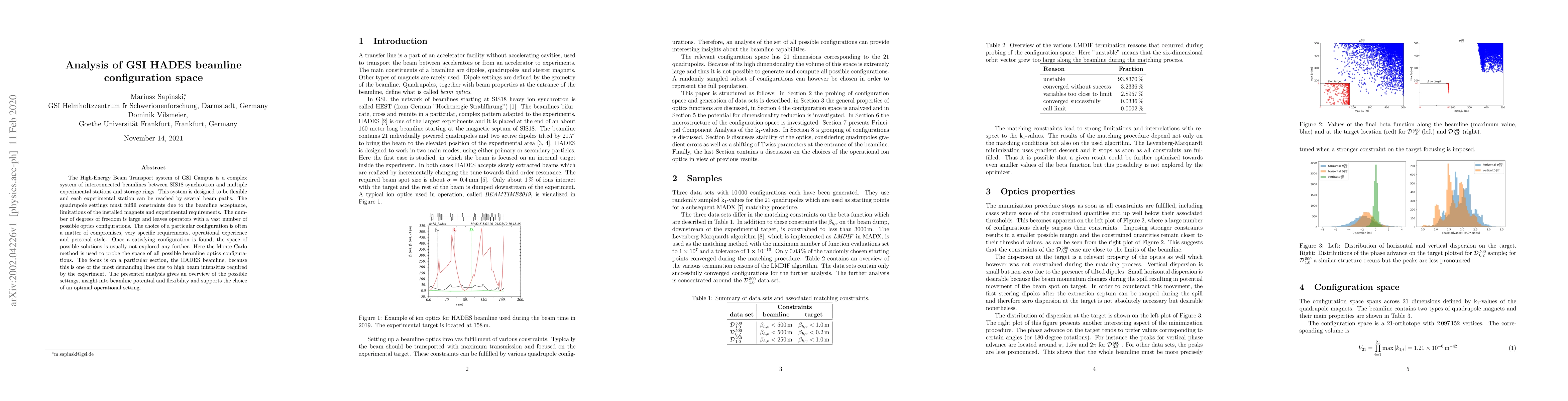 The High-Energy Beam Transport system of GSI Campus is a complex system of interconnected beamlines between SIS18 synchrotron and multiple experimental stations and storage rings. This system is designed to be flexible and each experimental station can be reached by several beam paths. The quadrupole settings must fulfill constraints due to the beamline acceptance, limitations of the installed magnets and experimental requirements. The number of degrees of freedom is large and leaves operators with a vast number of possible optics configurations. The choice of a particular configuration is often a matter of compromises, very specific requirements, operational experience and personal style. Once a satisfying configuration is found, the space of possible solutions is usually not explored any further. Here the Monte Carlo method is used to probe the space of all possible beamline optics configurations. The focus is on a particular section, the HADES beamline, because this is one of the most demanding lines due to high beam intensities required by the experiment. The presented analysis gives an overview of the possible settings, insight into beamline potential and flexibility and supports the choice of an optimal operational setting.