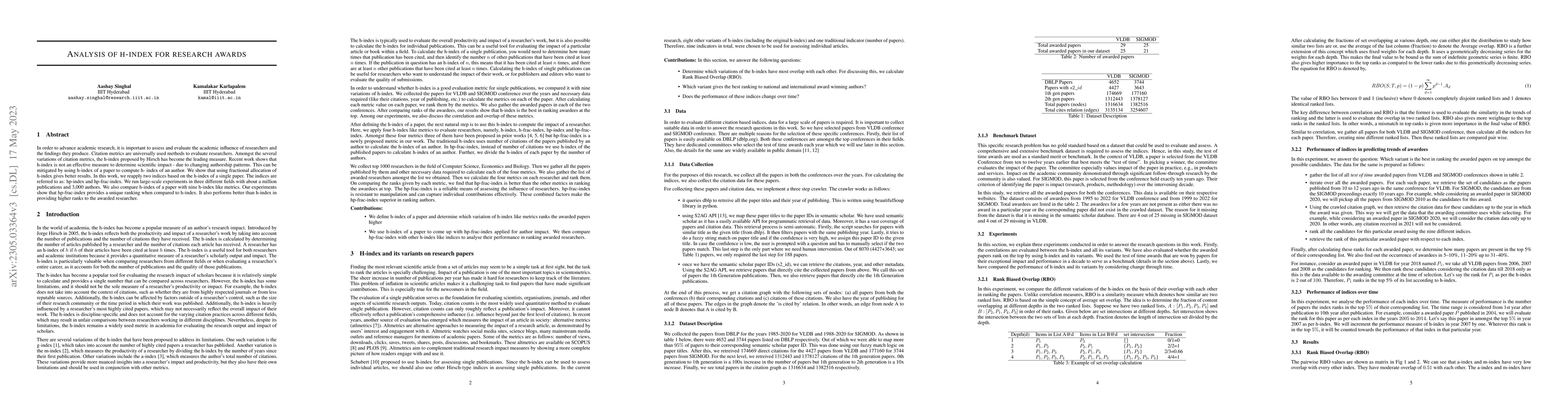 In order to advance academic research, it is important to assess and evaluate the academic influence of researchers and the findings they produce. Citation metrics are universally used methods to evaluate researchers. Amongst the several variations of citation metrics, the h-index proposed by Hirsch has become the leading measure. Recent work shows that h-index is not an effective measure to determine scientific impact - due to changing authorship patterns. This can be mitigated by using h-index of a paper to compute h- index of an author. We show that using fractional allocation of h-index gives better results. In this work, we reapply two indices based on the h-index of a single paper. The indices are referred to as: hp-index and hp-frac-index. We run large-scale experiments in three different fields with about a million publications and 3,000 authors. We also compare h-index of a paper with nine h-index like metrics. Our experiments show that hp-frac-index provides a unique ranking when compared to h-index. It also performs better than h-index in providing higher ranks to the awarded researcher.